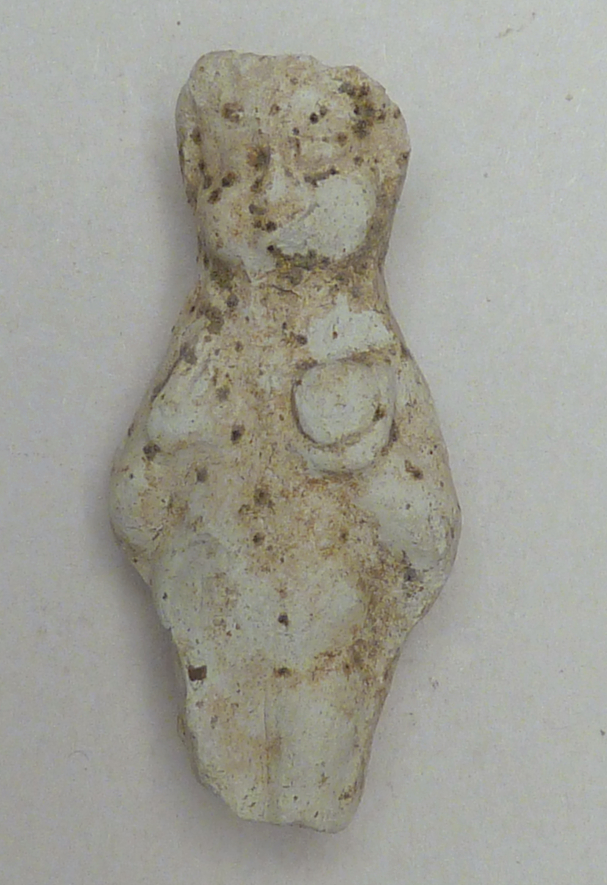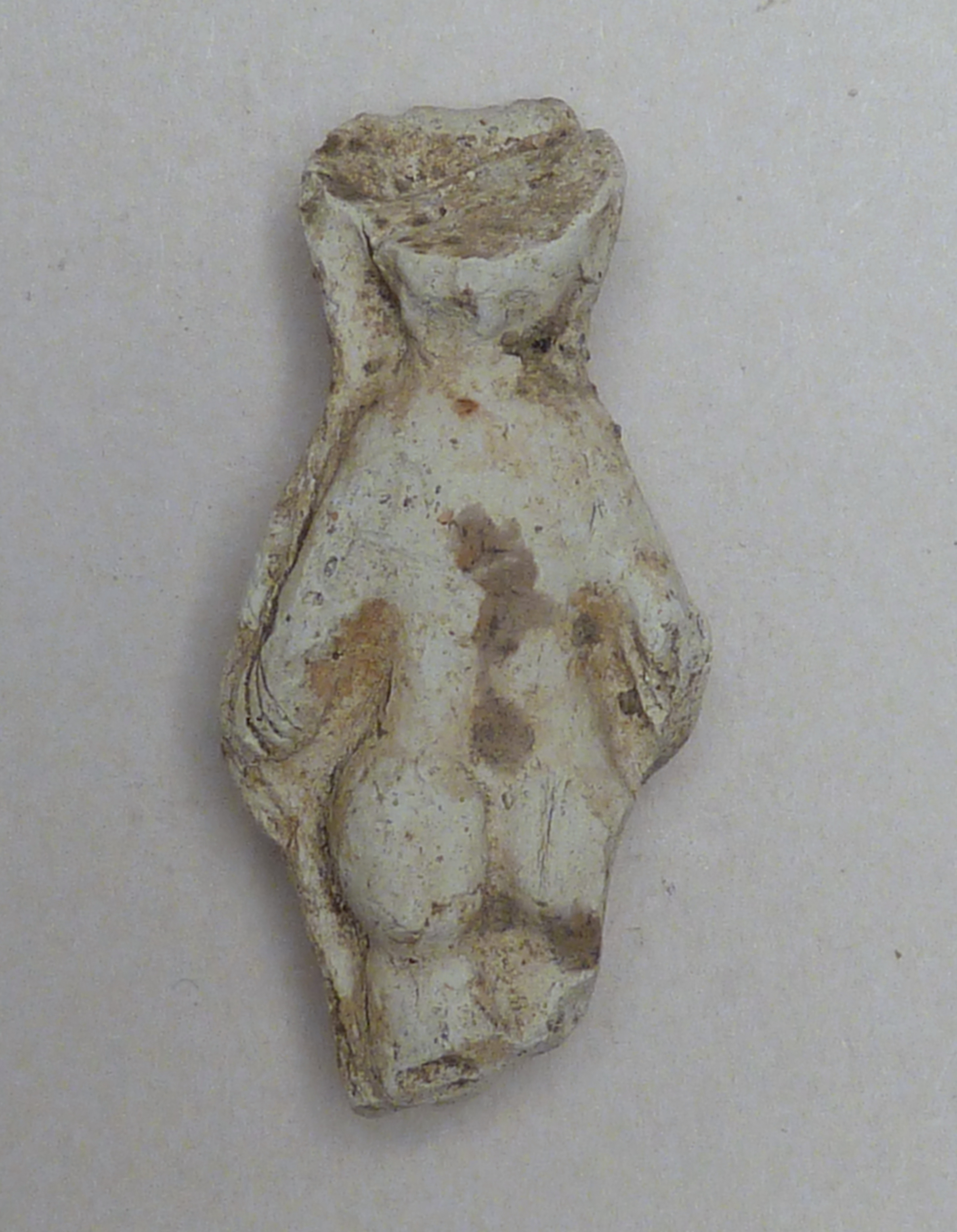 Pijpaarde fragment uit verdronken land van Zuid-Beveland: staand Christuskind met rijksappel