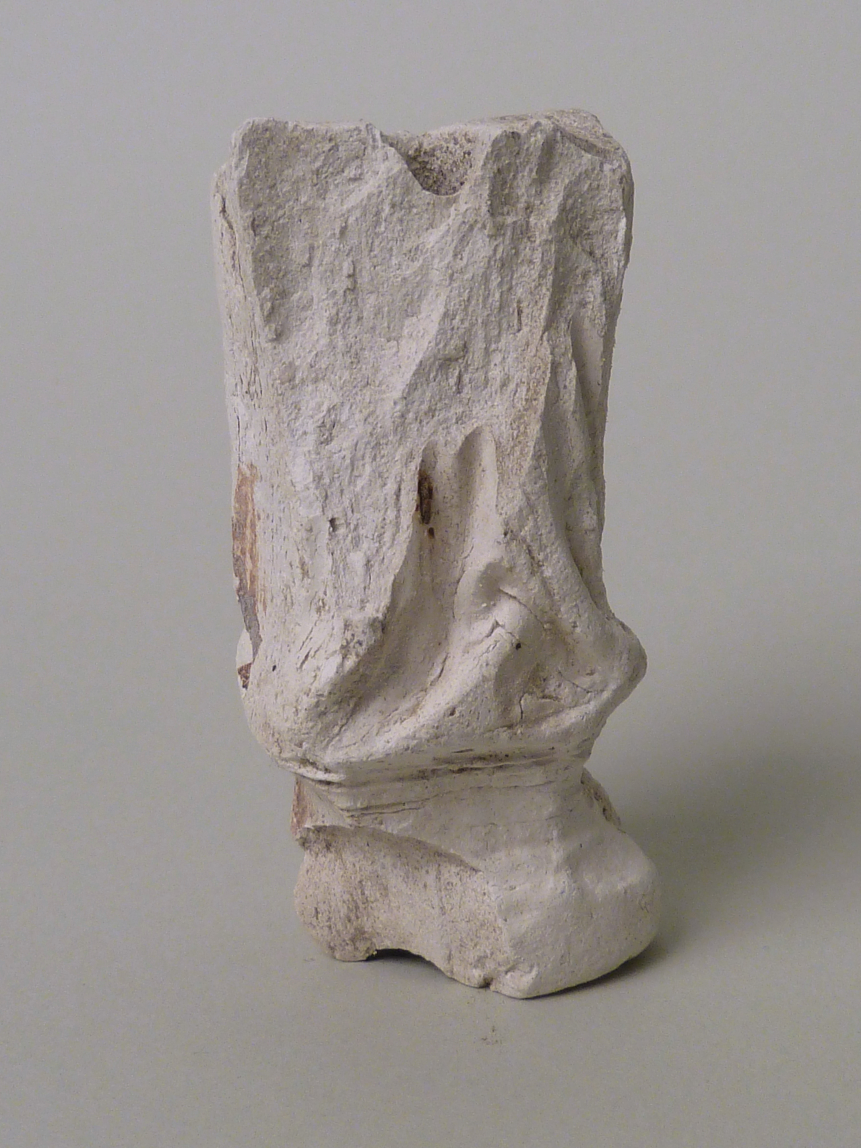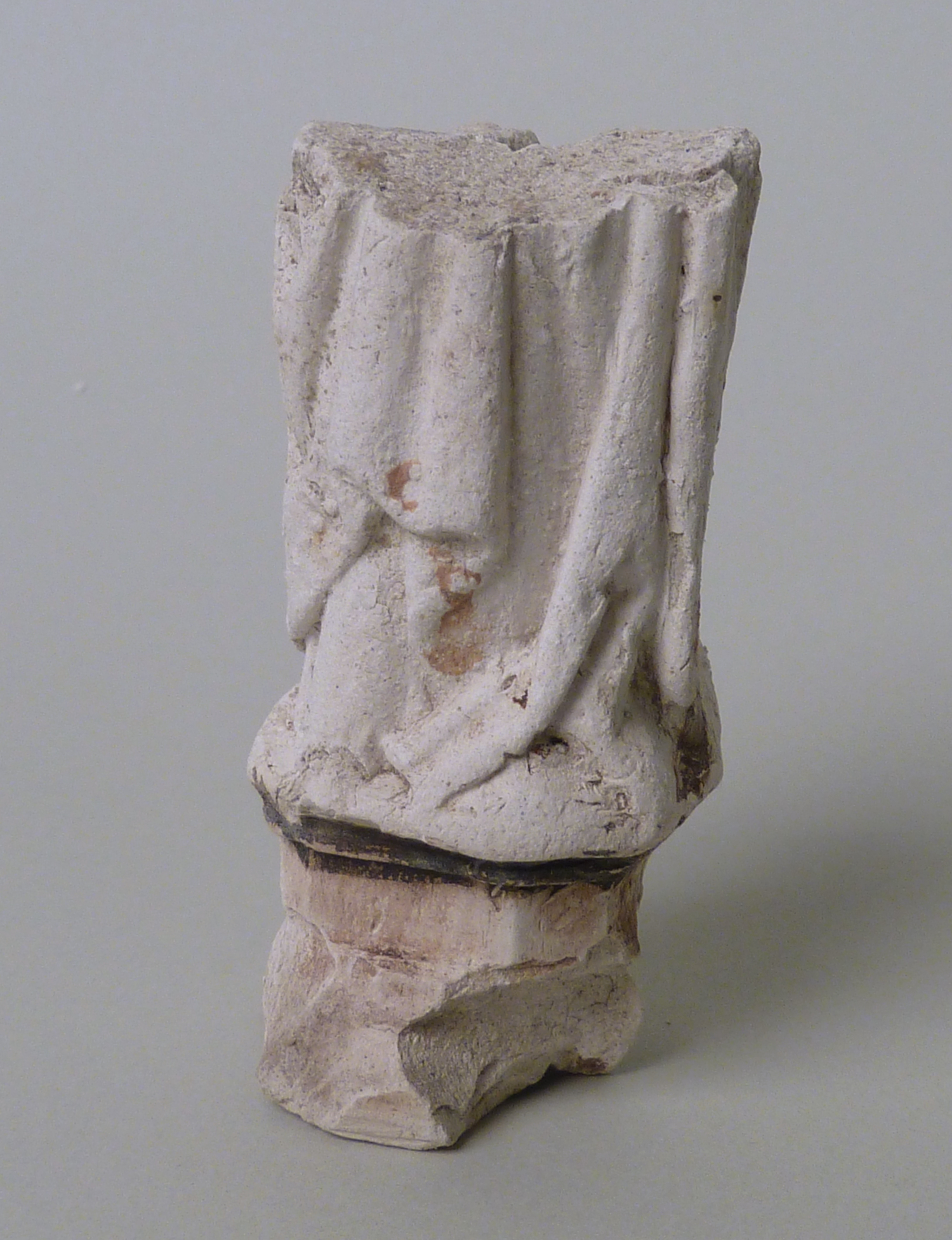 Pijpaarde fragment uit verdronken land van Zuid-Beveland: Maria staande op sokkel met restanten zwarte verf