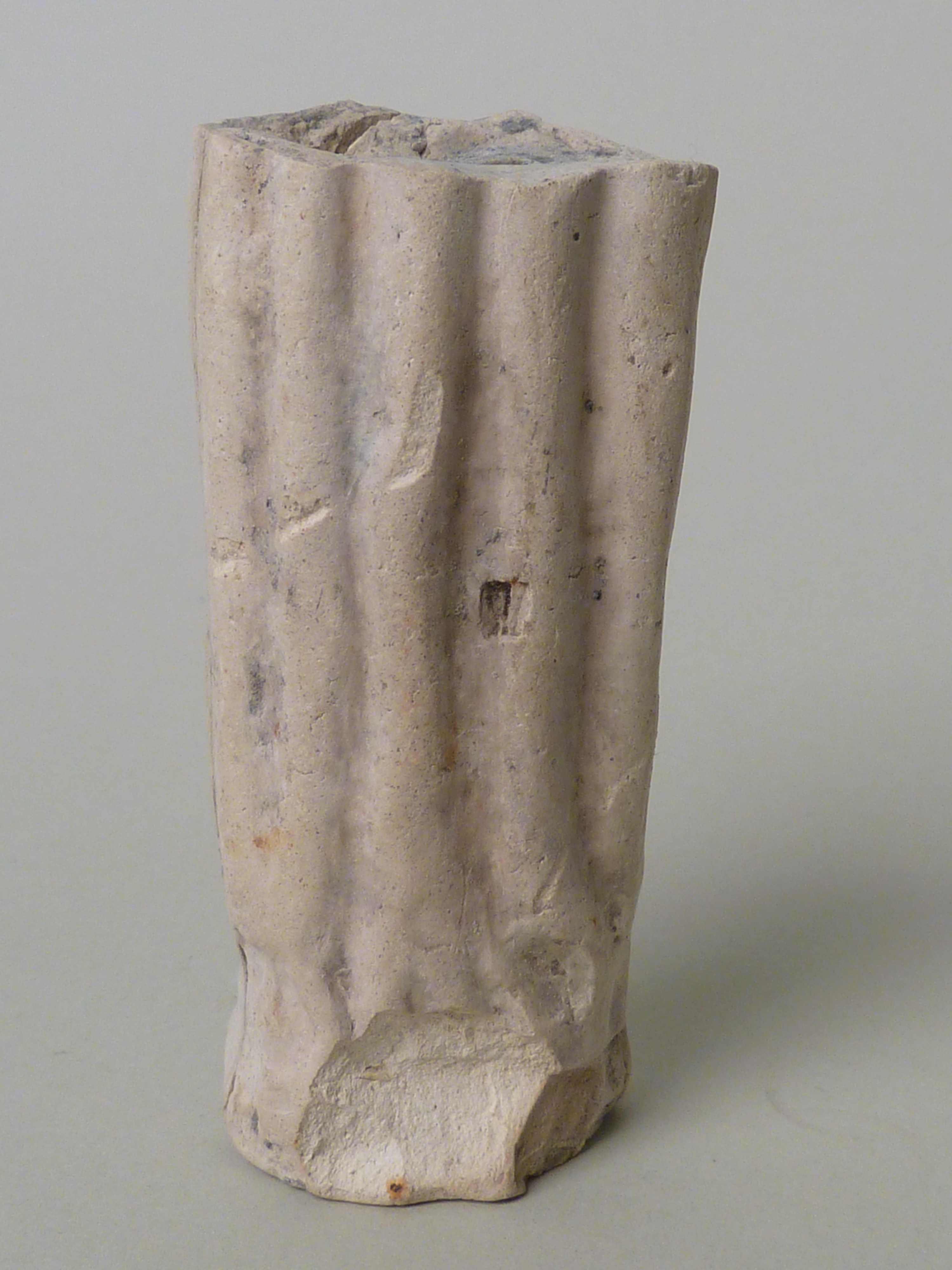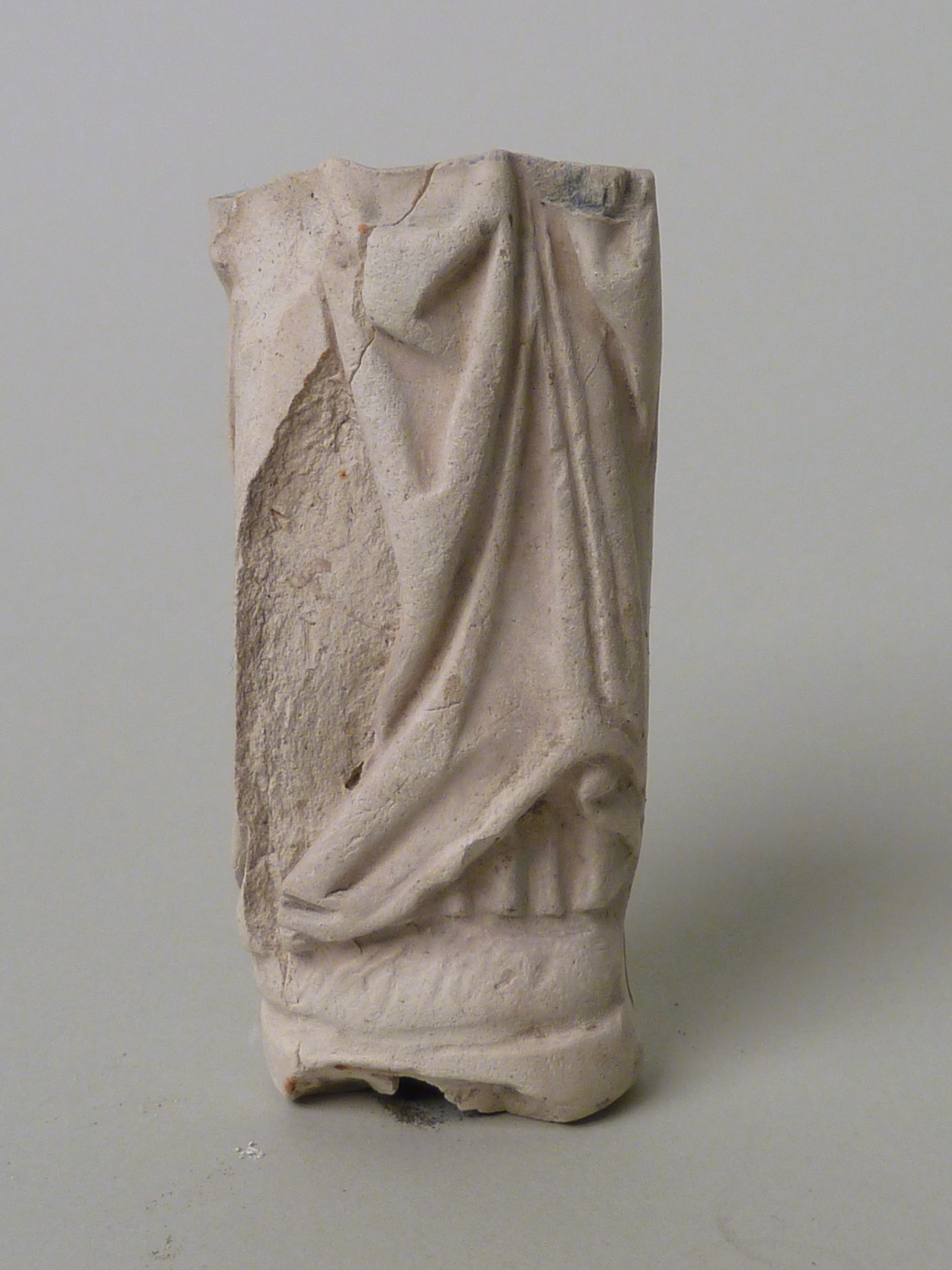 Pijpaarde fragment uit verdronken land van Zuid-Beveland: Maria staande op sokkel