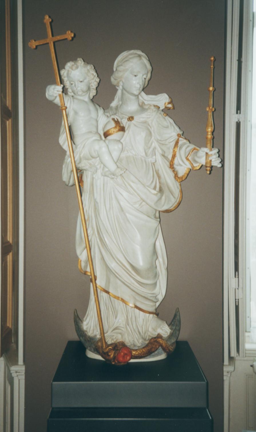 Maria staat op de maansikkel, rustend op haar rechterbeen. Zij heeft haar hoofd driekwart naar rechts gewend en draagt het Christuskind op haar rechterhand. In haar linker draagt ze een scepter. Om de maansikkel is een slang gekruld, die een appel in de bek heeft. Het Christuskind heeft zijn hoofd driekwart naar links gewend. Hij ...