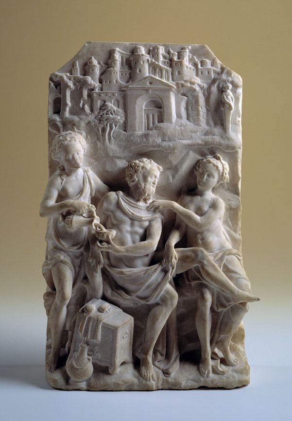 Tegen een rotsachtig landschap met op de achtergrond de stad Sodom, wordt Lot door zijn dochters verleid. Hij zit in het midden op een rots. Zijn gezicht en zijn benen zijn bijna en profil naar rechts gewend, zijn bovenlichaam is frontaal weergegeven. Hij heeft golvend haar en een gespleten baard. In zijn linkerhand houdt hij ...
