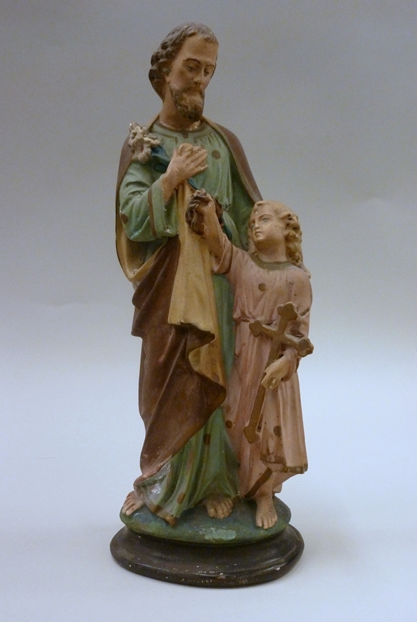 Jozef met Christuskind dat in rechterhand doornenkroon en in linkerhand kruis heeft