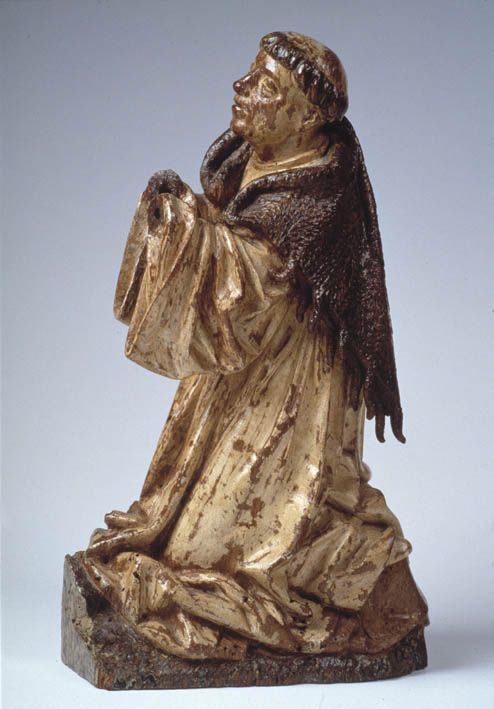 De kanunnik knielt en profil naar links op een met fijne zigzaggroeven aangeduide grond. Hij houdt zijn hoofd iets schuin en kijkt iets omhoog. Beide, nu verdwenen, handen houdt hij half geheven. Rond zijn grote tonsuur een smalle haarkrans. Hij is gekleed in een wijde superplie die rondom hem in vele kreukels de bodem bedekt. ...