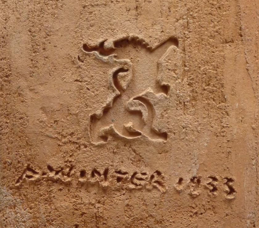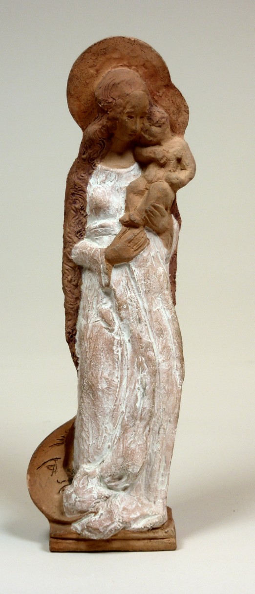 Maria met kind, beiden met aureool. Maria in wit gewaad, links bij haar voeten de maansikkel. Op de achterzijde een stempel voorstellend een klimmende leeuw en ingekraste signatuur en datering: A.WINTER 1933.