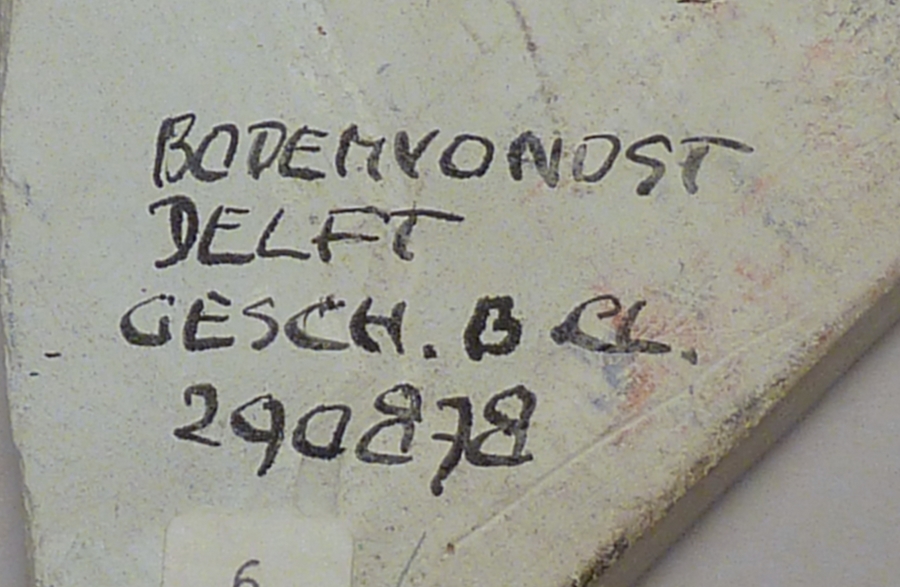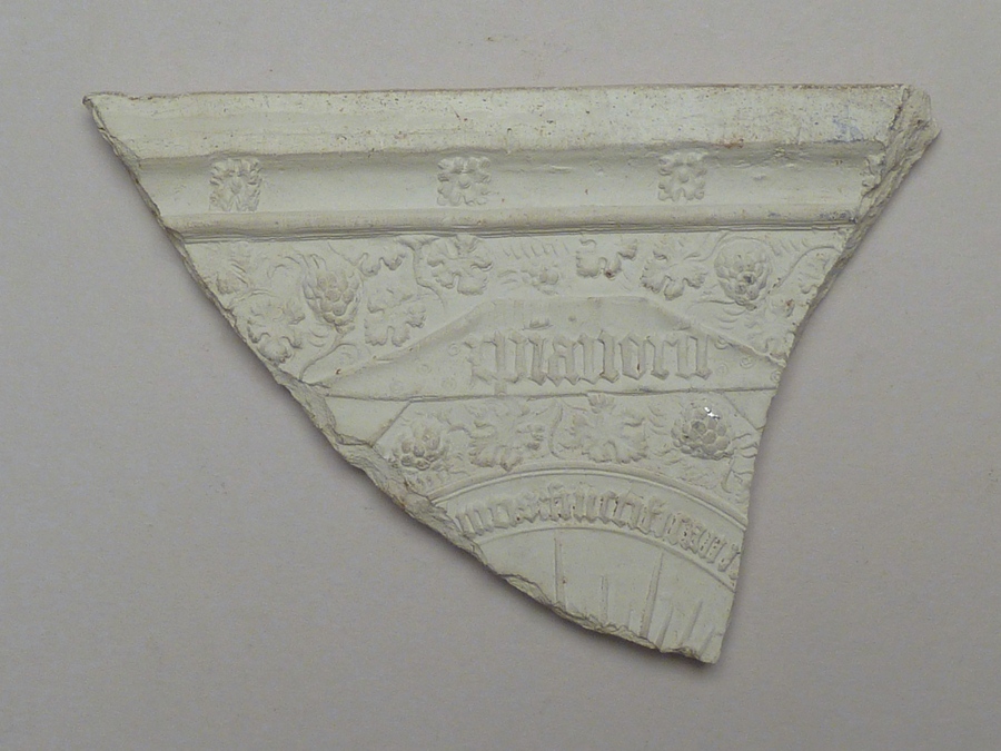 Bovenzijde reliëf met lijst, druivenrankornament, tekstbanderol, vondst Delft