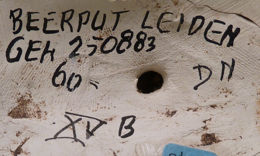 Naakt Christuskind zittend op koude steen, naar links neigend, vondst Leiden