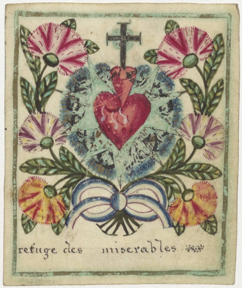 H. Hart met kruis en bloemen, met "refuge des miserables", ingekleurd