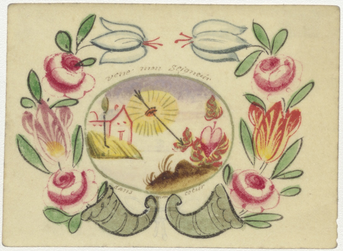 Pijl met oog en brandend hart, links een huis, met "Vene mon seigneur dans mon coeur"