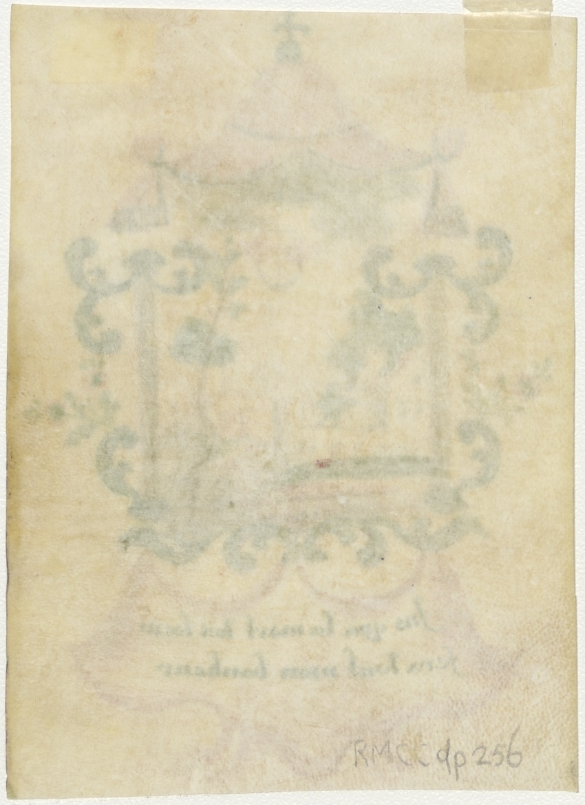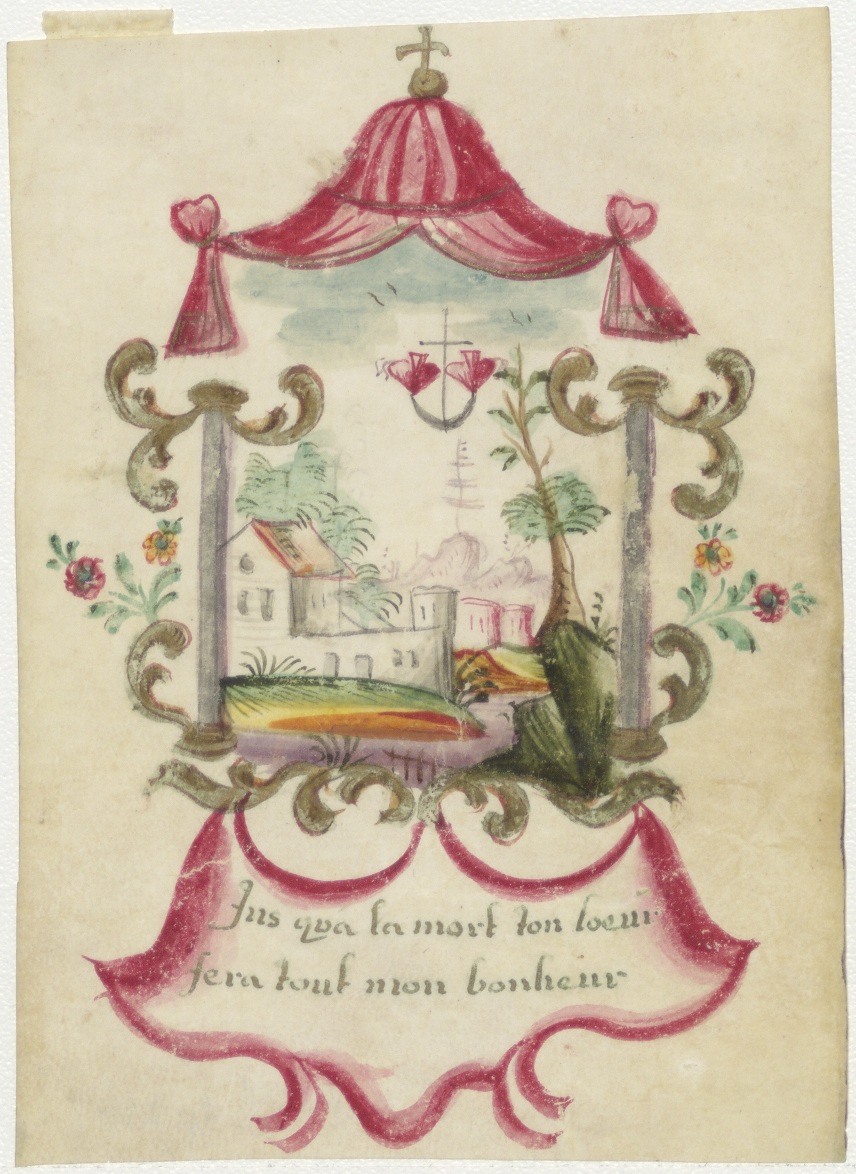 (Klooster)gebouw in landschap onder baldakijn, met "Jus qua la mort ton coeur fera tout mon bonheur"