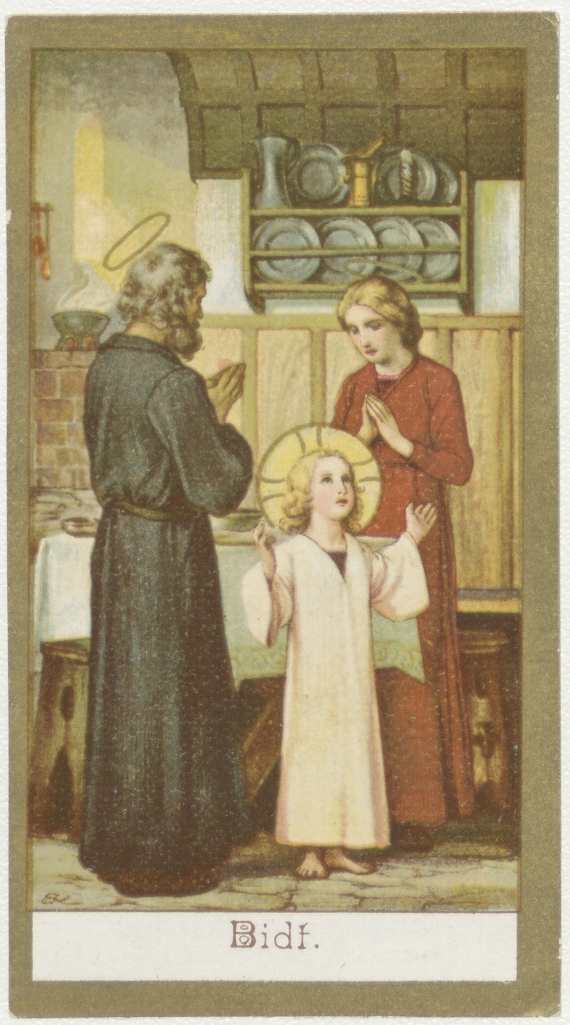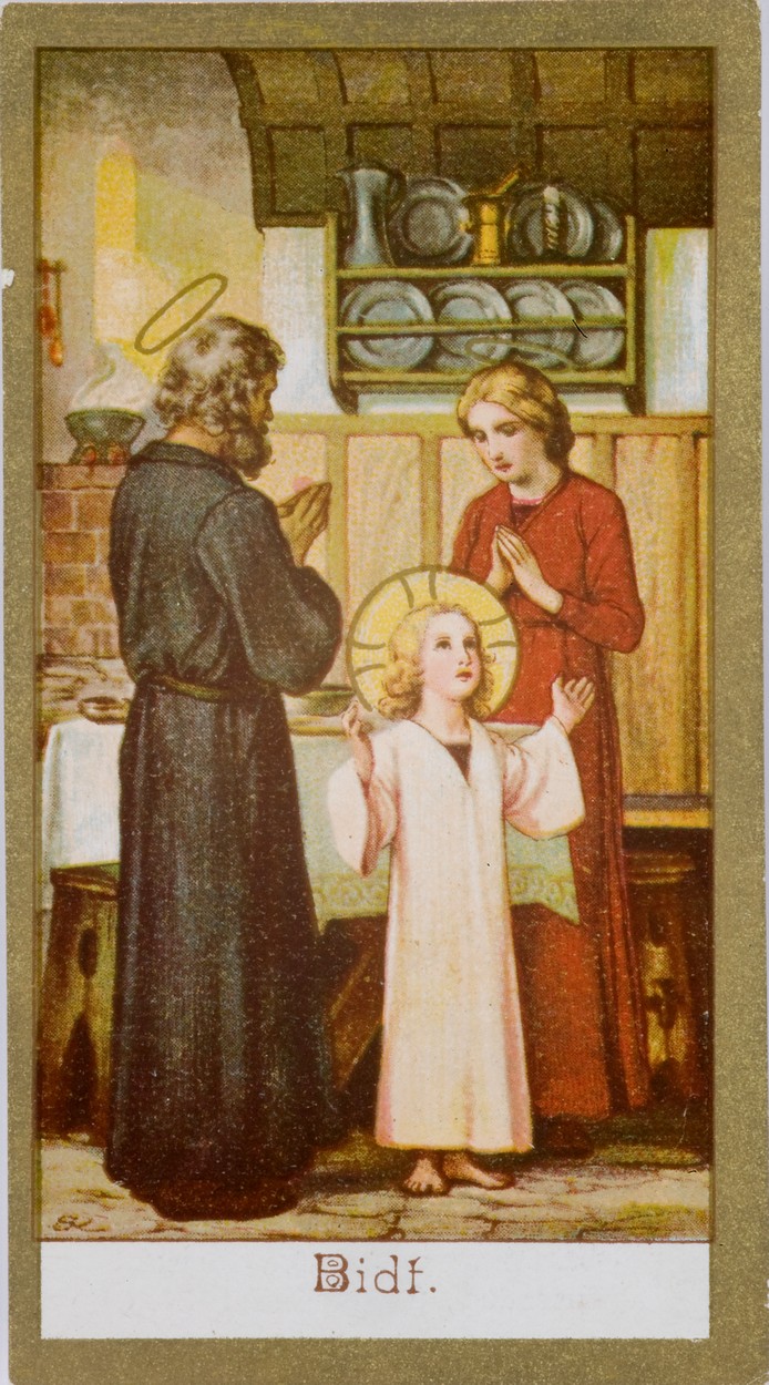 Heilige Familie, staande biddend in kamer met bordenrek, met "Bidt.", kz. Gebed en oproep