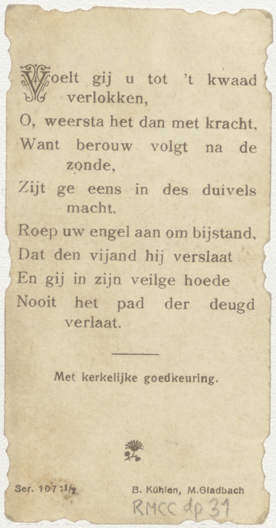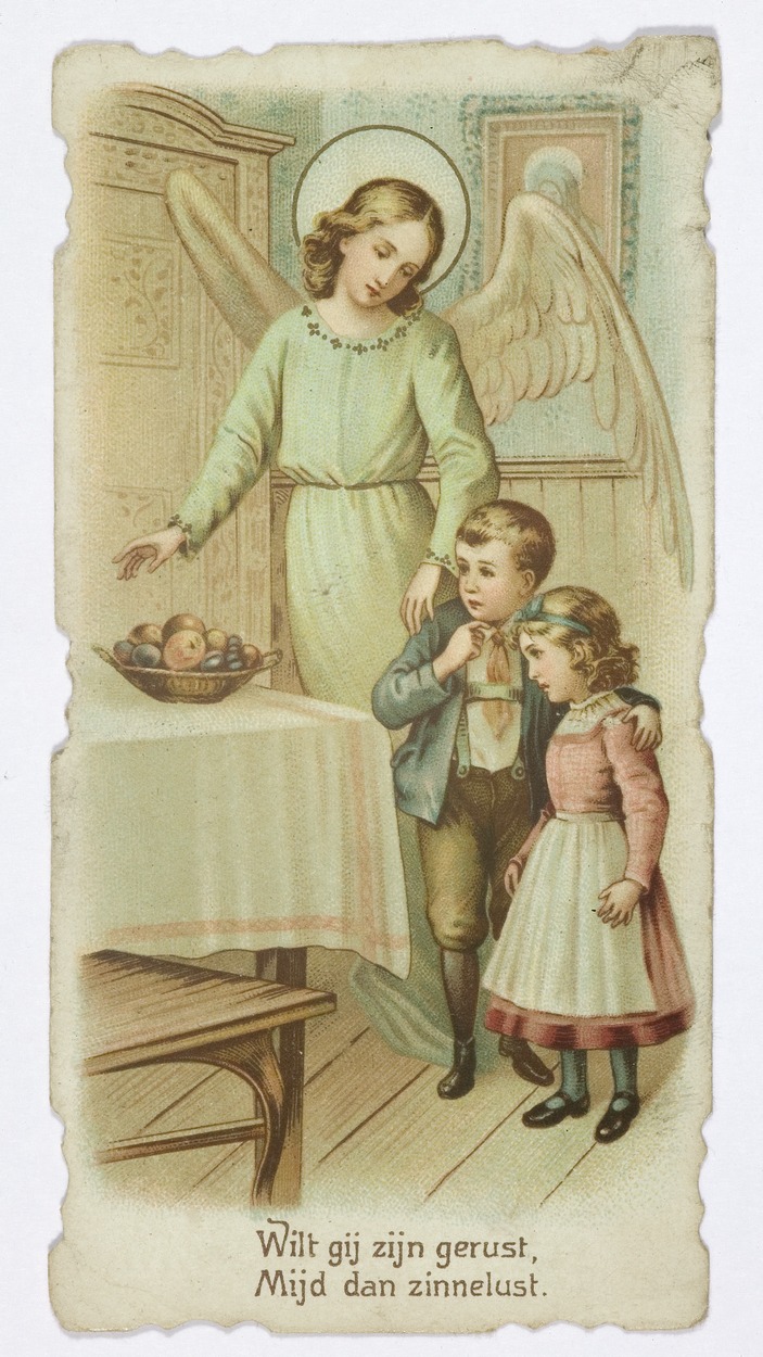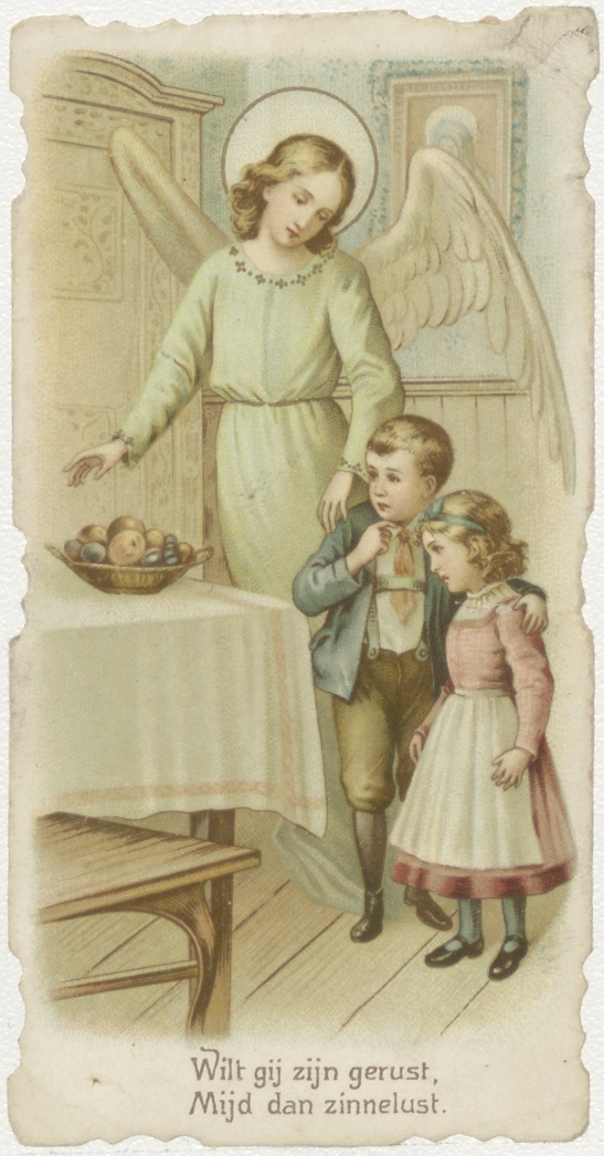 Engelbewaarder verhindert een jongetje en meisje fruit te stelen, met "Wilt gij zijn gerust, mijd dan zinnelust.", kz. Gedicht: "Voelt gij u tot ’t kwaad verlokken, O, weersta het dan met kracht. Want berouw volgt na de zonde, Zijt ge eens in des duivels macht. Roep uw engel aan tot bijstand, Dat den vijand hij ...