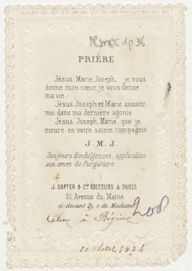 Heilige Harten van Maria, Jezus en Jozef, met "... je vous donne mon coeur, ...", kz. Gebed (Frans), handschrift "Céline à Régine 10 Août 1874"