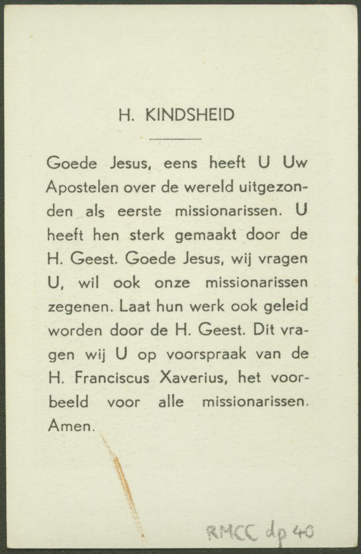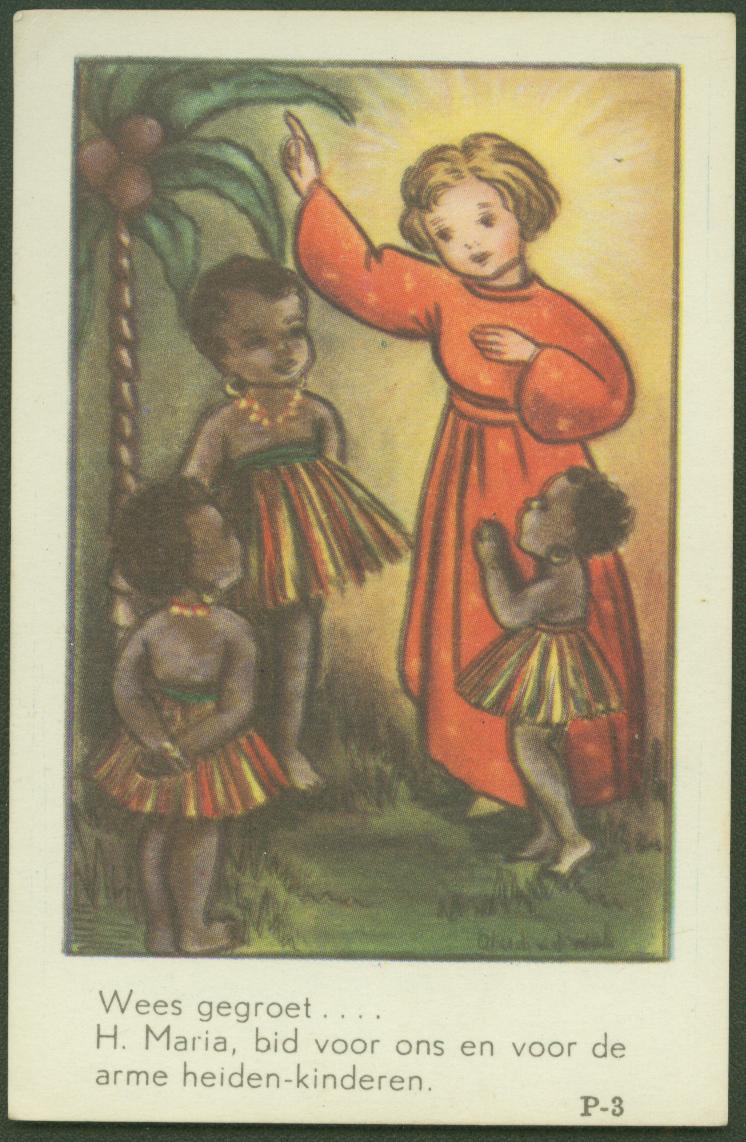 Missieprentje met Jezuskind met drie Afrikaanse kinderen, met "Wees gegroet .... H. Maria, bid voor ons en voor de arme heiden-kinderen.", kz. "H. Kindsheid Goede Jesus, eens heeft U Uw apostelen over de wereld uitgezonden als eerste missionarissen. ..."