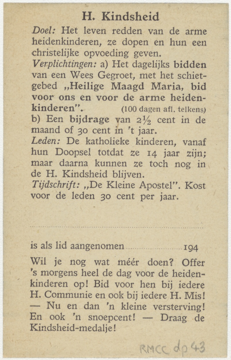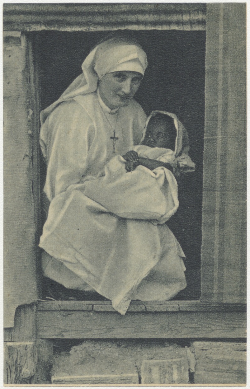 Lidmaatschapsprentje van de H. Kindsheid met Europese zuster met Afrikaanse baby op de arm, kz. "H. Kindsheid Doel: Het leven redden van de arme heidenkinderen, ze dopen en hun een christelijke opvoeding geven. ..."