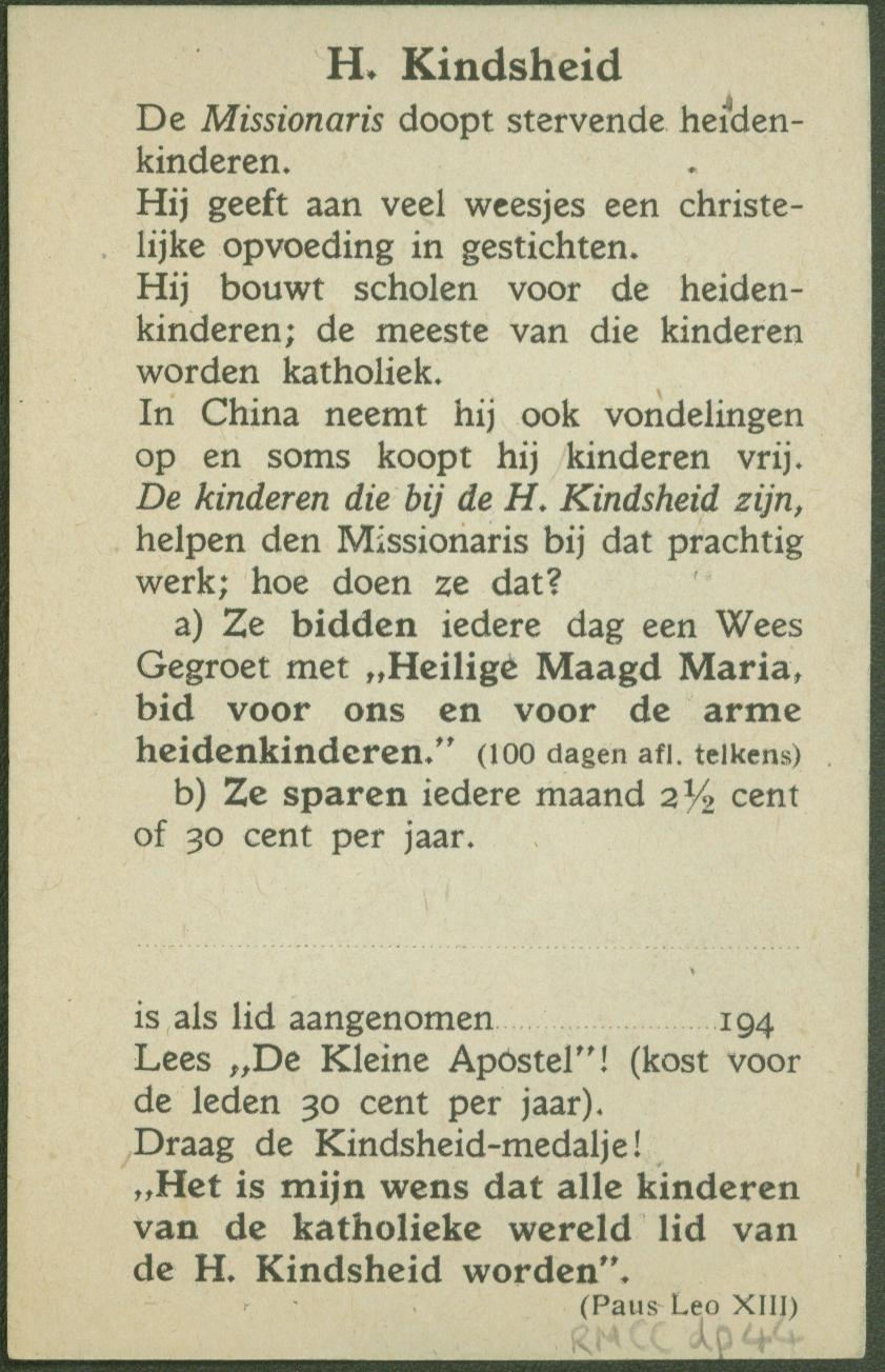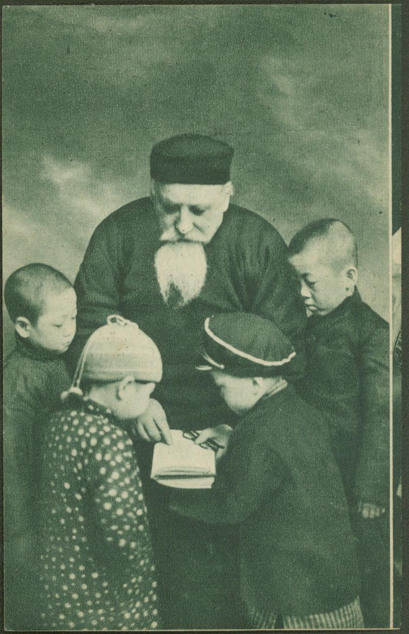 Lidmaatschapsprentje van de H. Kindsheid met Europese missionaris met vier Chinese kinderen, kz. "H. Kindsheid De missionaris doopt stervende heidenkinderen. Hij geeft aan veel weesjes een christelijke opvoeding in gestichten. ..."