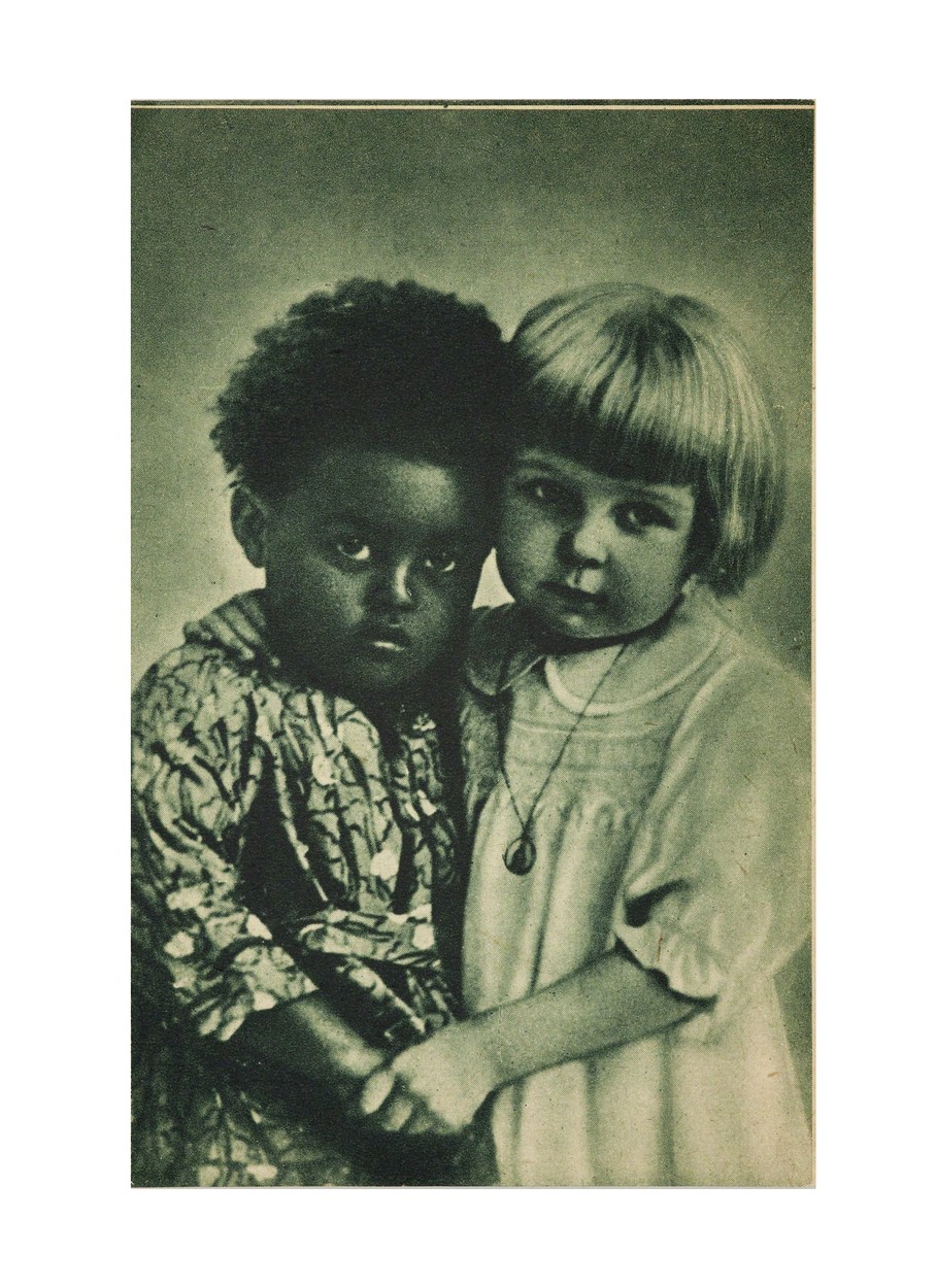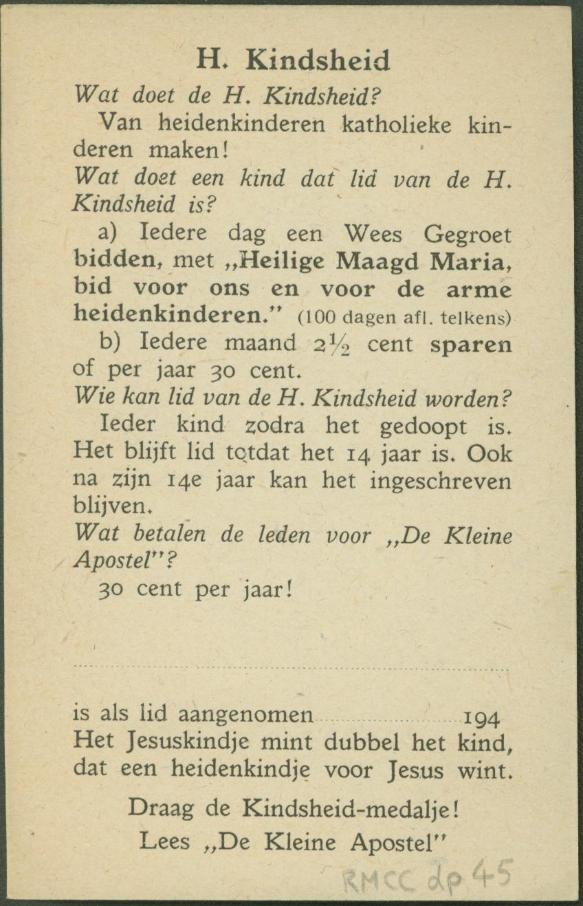 Lidmaatschapsprentje van de H. Kindsheid met Afrikaans meisje en Europees meisje die elkaars hand vasthouden, kz. "H. Kindsheid Wat doet de H. Kindsheid? Van heidenkinderen katholieke kinderen maken! ..."