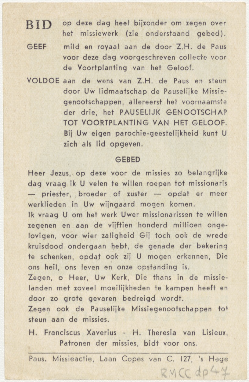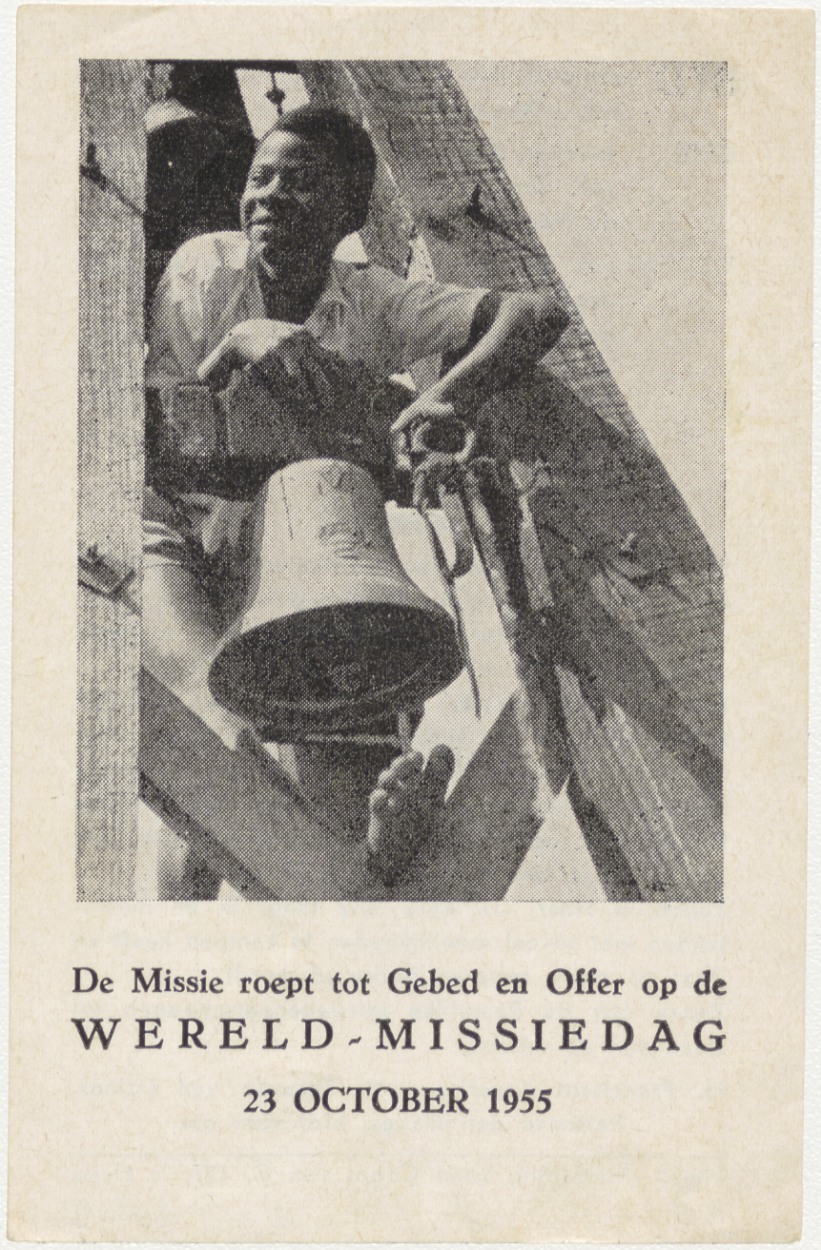 Missieprentje met Afrikaanse man in klokkentoren, met "De missie roept tot gebed en offer op de wereld-missiedag 23 october 1955", kz. "Bid op deze dag heel bijzonder om zegen over het missiewerk (zie onderstaand gebed). ..."