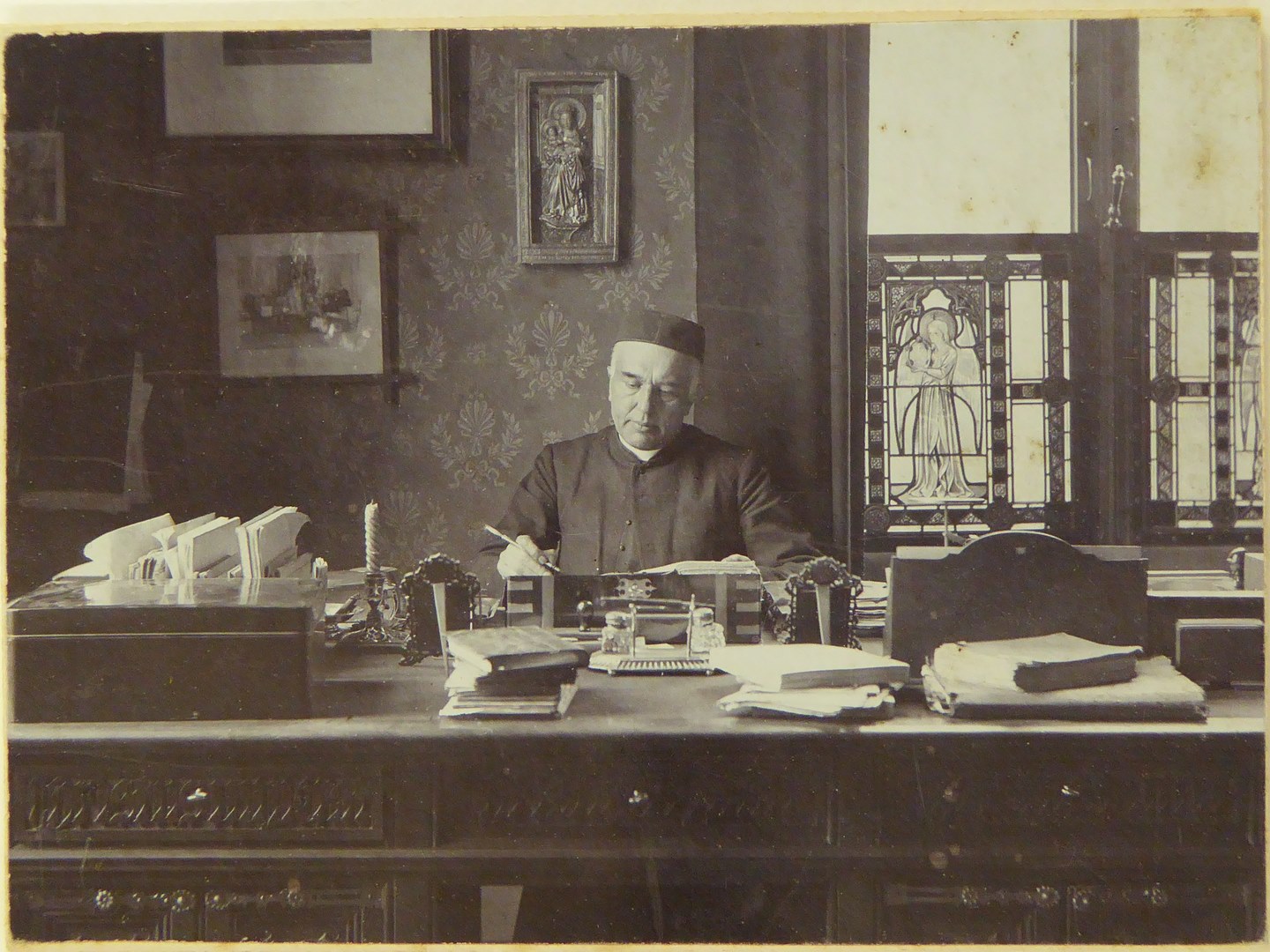 Portret van Mgr. Antonius Hubertus Leonardus Hensen (1854-1932), professor Seminarie Warmond, zittend achter bureau