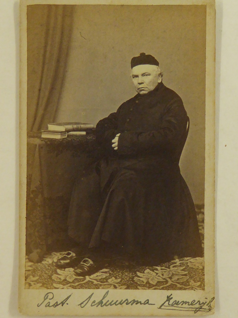 Portret van pastoor Schuurman, Kamerik, zittend aan tafel met boeken