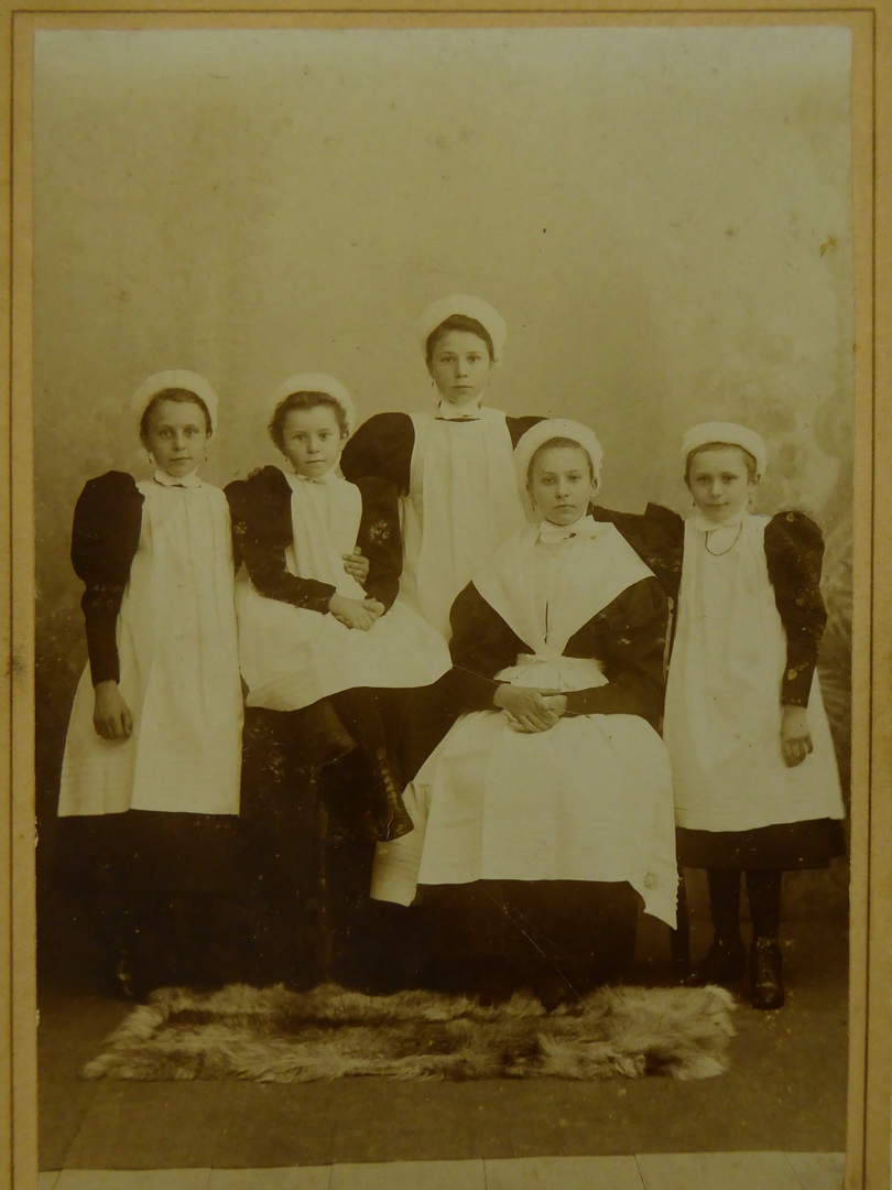 Groepsportret van vijf wezen uit het oud-katholiek weeshuis