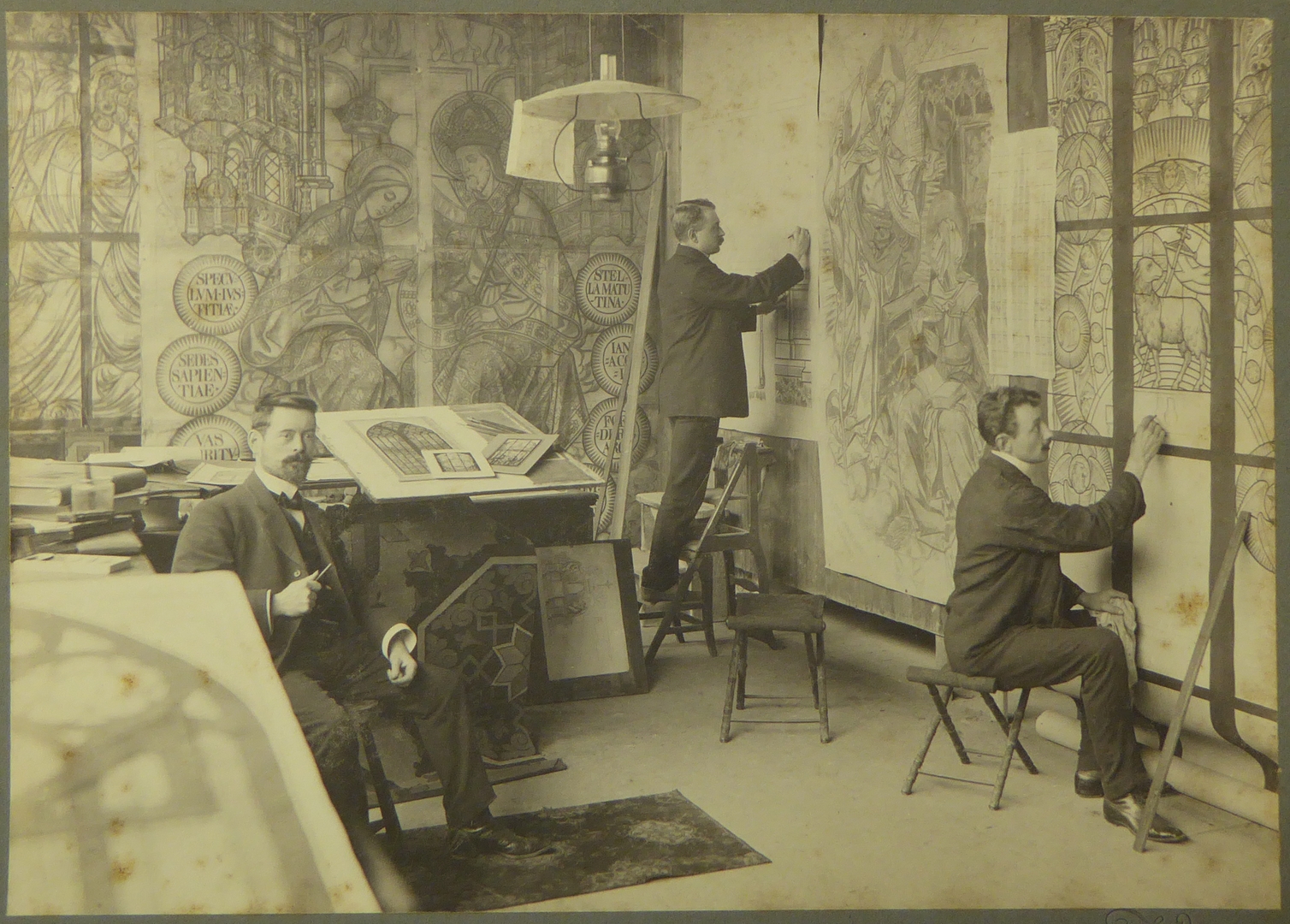 Atelier glazenier Otto M.M. Mengelberg (zittend), Maliebaan, Utrecht