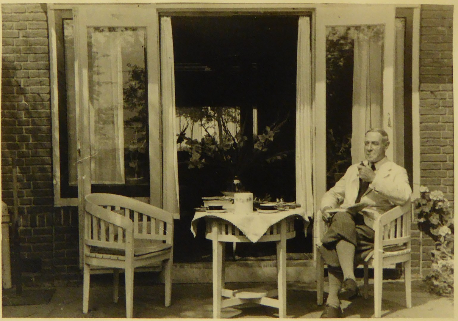 Prof. W. Vogelzang zittend voor openslaande deuren op terras