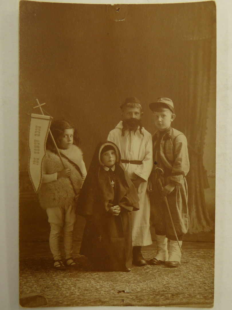 Vier kinderen uit een kindsheidprocessie: Johannes de Doper, kloosterzuster, witte pater van kardinaal Lavigerie en een zouaaf