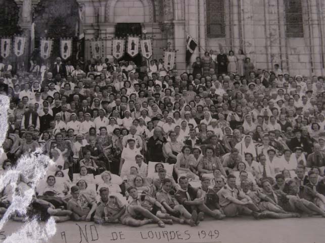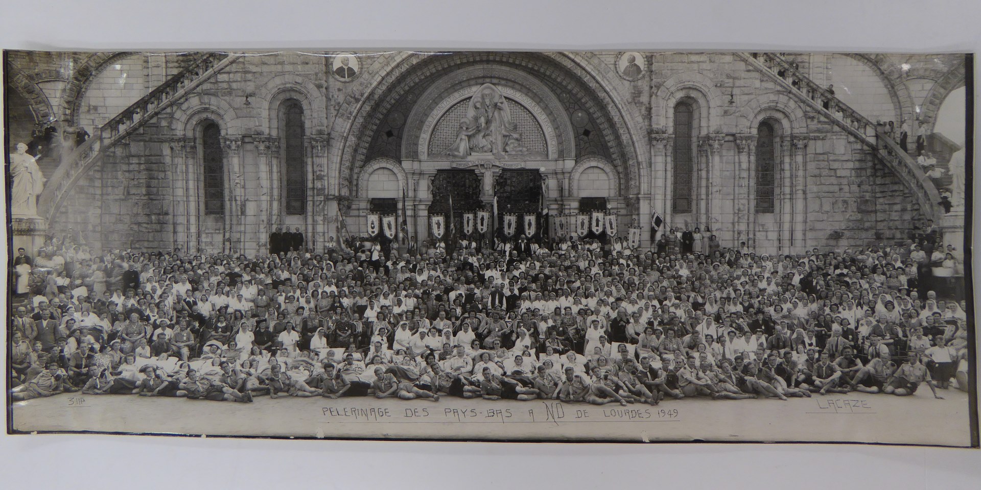 Groepsfoto voor de Rozenkransbasiliek van de Nederlandse pelgrimage naar O.L.V. van Lourdes met in het midden Mgr. J. Huibers
