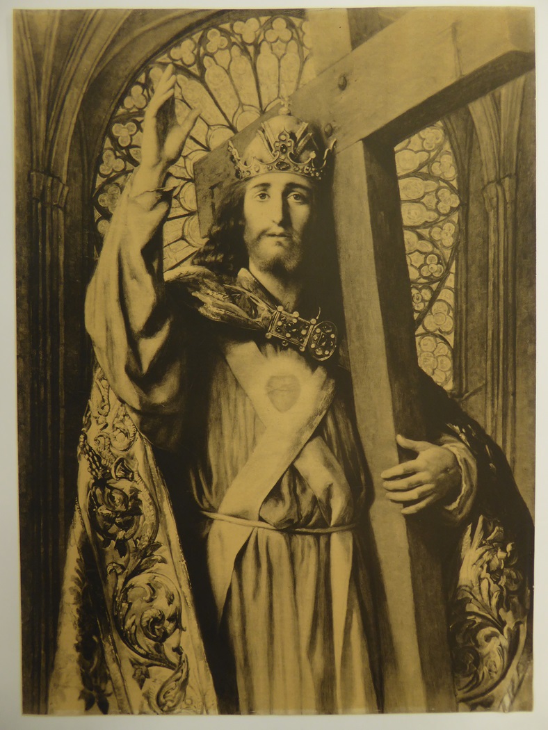 Gekroonde H. Hart Christus met kruis staande in kerkinterieur