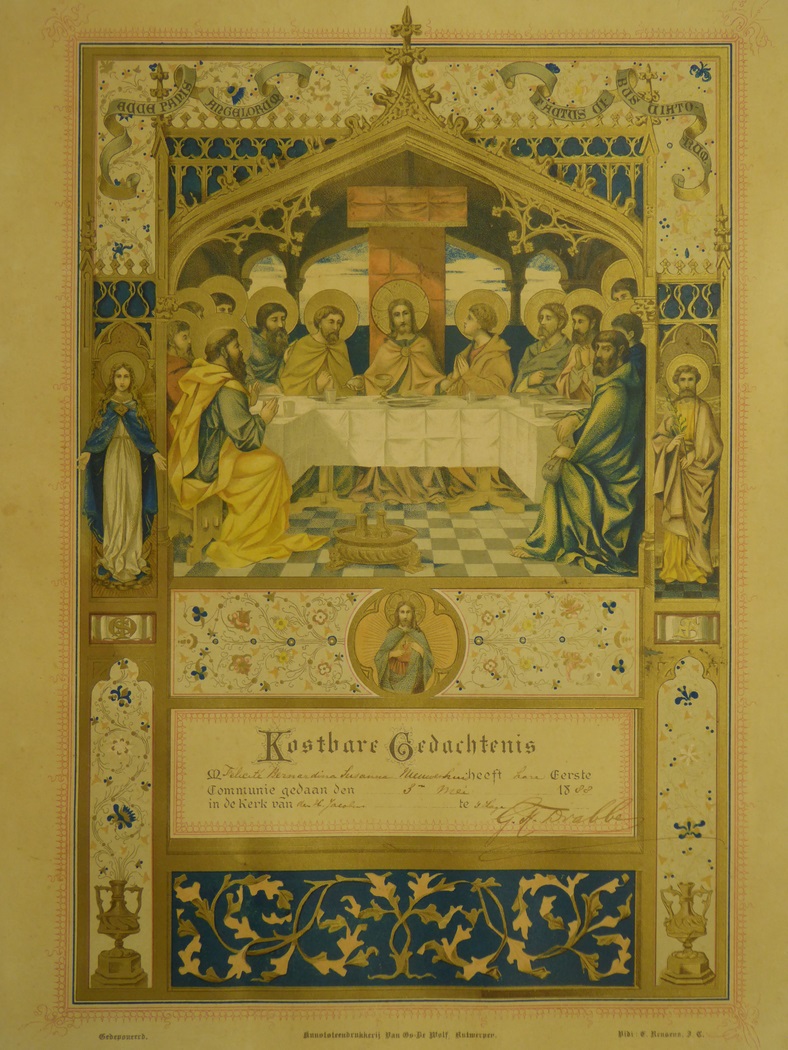 Eerste communieprent met laatste avondmaal, van Felicité Bernardina Susanna Nieuwenhuis