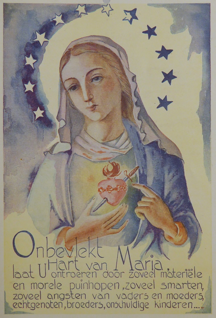 Wandprent in kleur met "Onbevlekt hart van Maria, laat U ontroeren ..." en afbeelding, kz. gebed