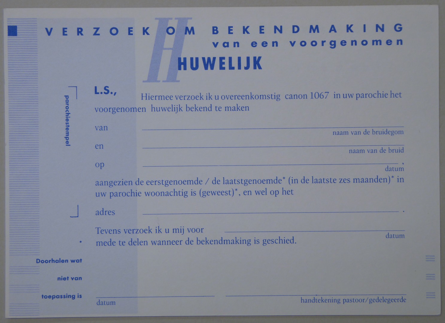 Oningevulde briefkaart: verzoek om bekendmaking van een voorgenomen huwelijk (Rooms Katholiek)