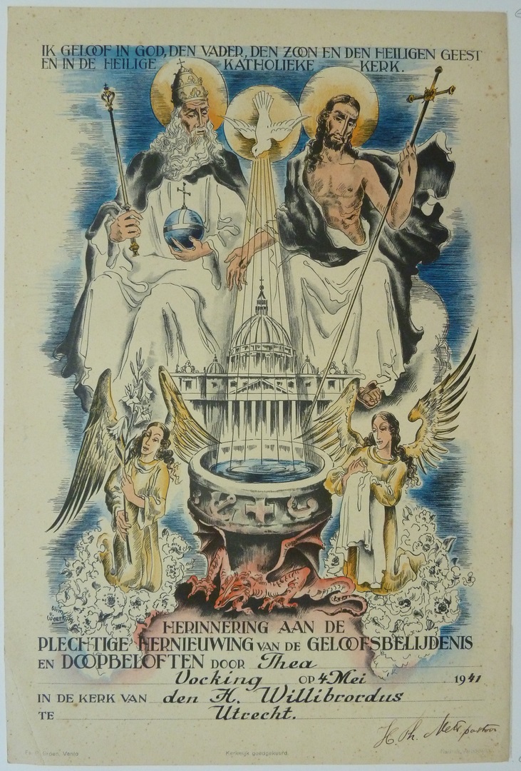 Plechtige-communieprent van Thea Vocking met Drievuldigheid, doopvont en St. Pieter te Rome