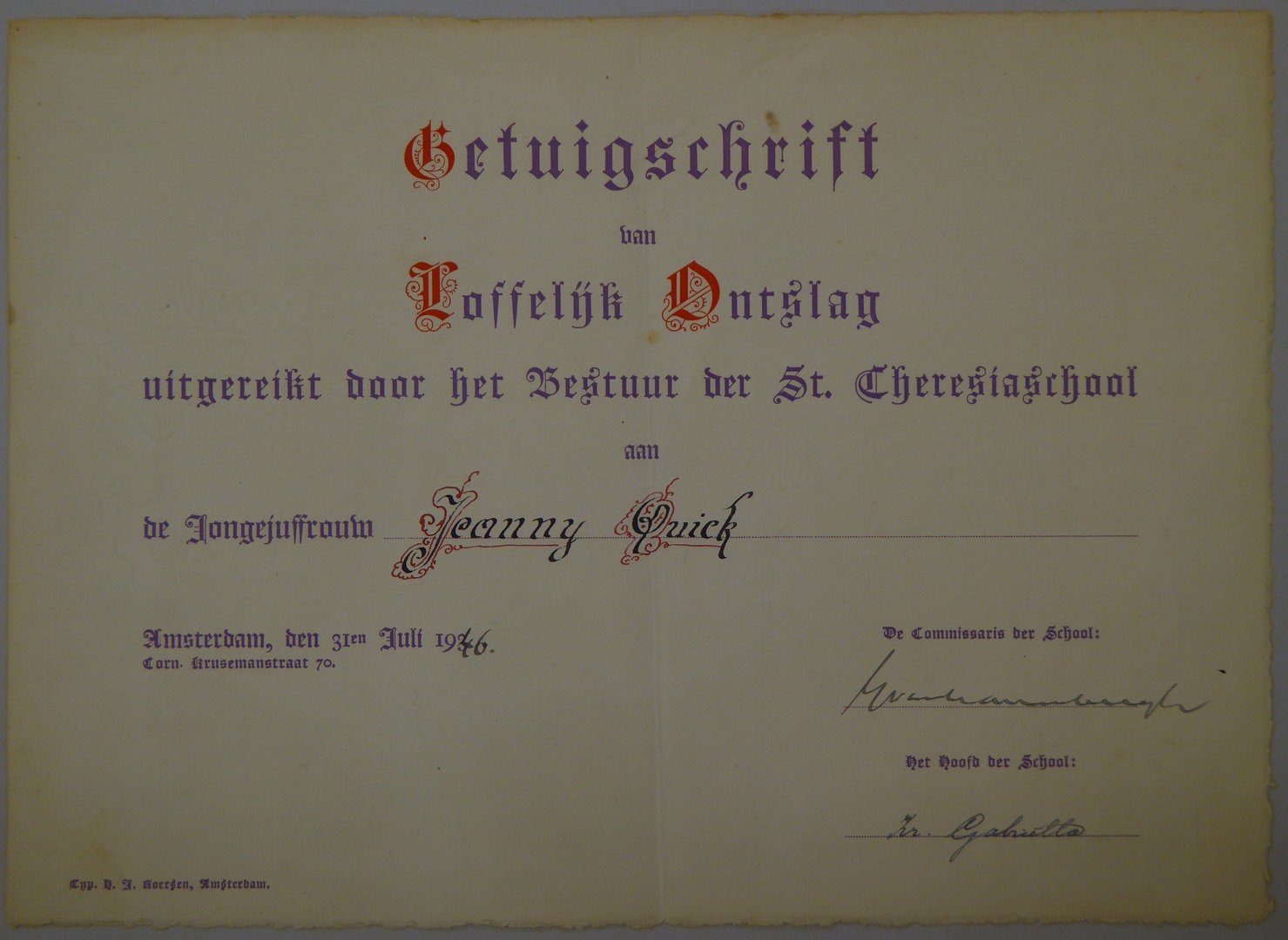 Getuigschrift van loffelijk ontslag uitgereikt ... St. Thereriaschool aan ... Jeanny Quick