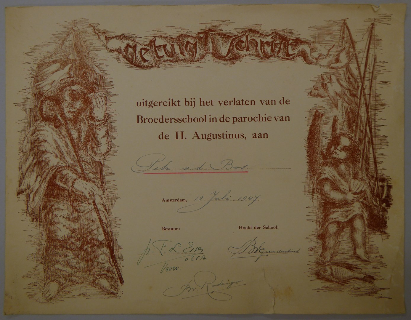Getuigschrift van Petrus van den Bos bij verlaten van de Broedersschool, Augustinusparochie Amsterdam