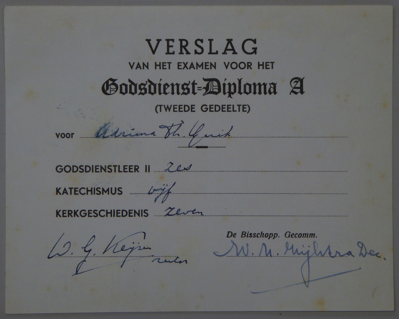 Verslag van het examen voor het godsdienstdiploma A, tweede gedeelte, van Adrina Th. Quik