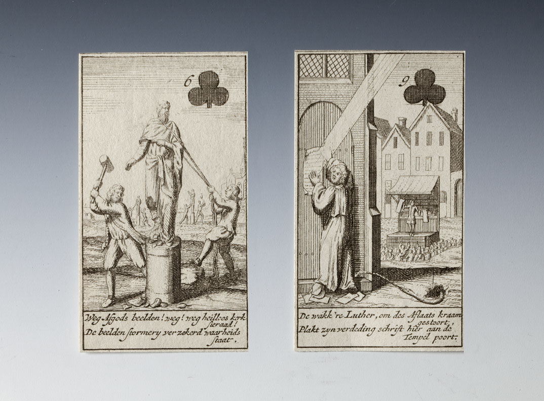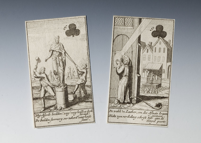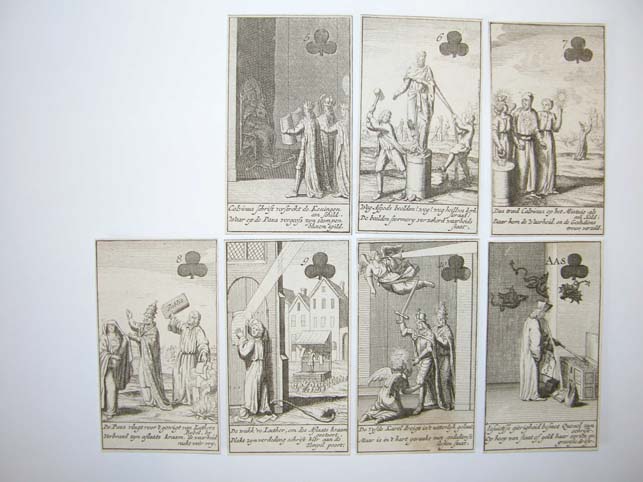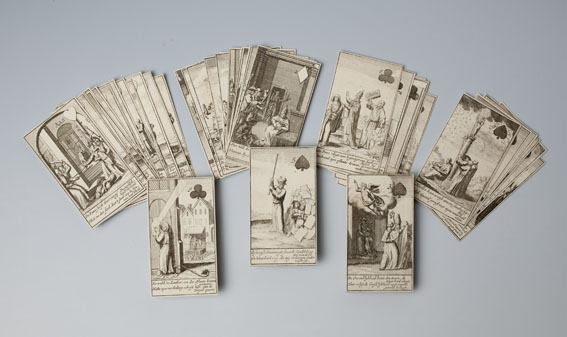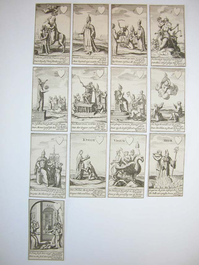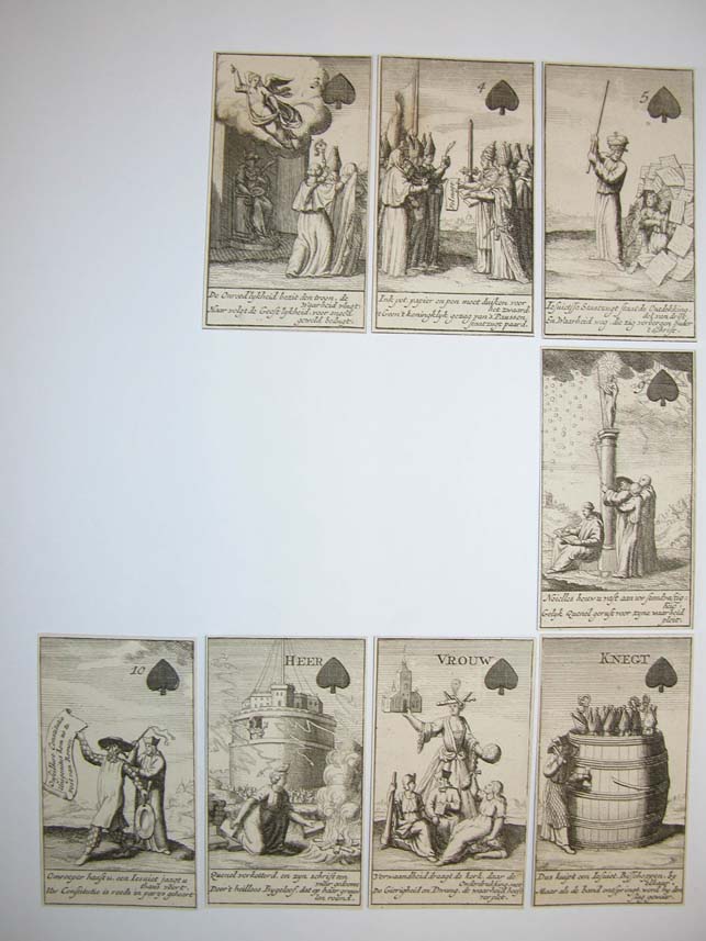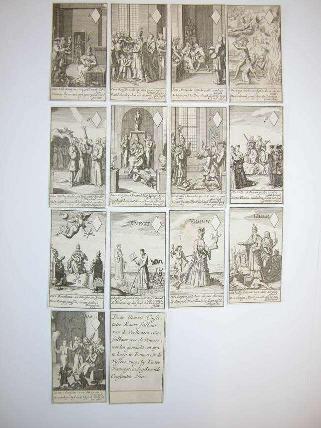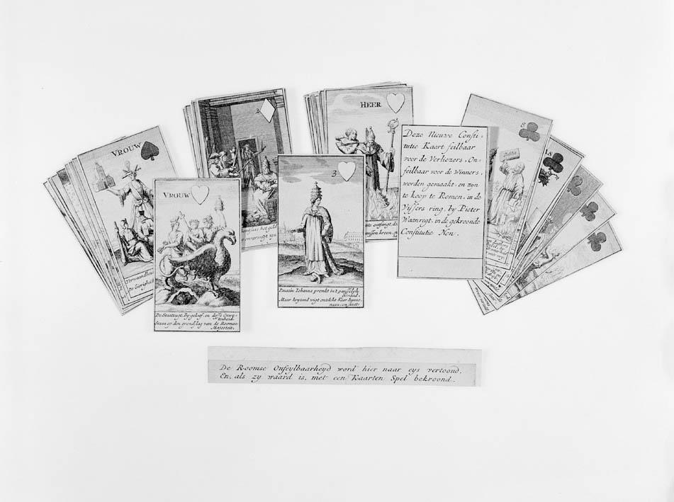 Kaartspel (incompleet): kaart met "Deze nieuwe constitutie kaart ...", 13 harten, 13 ruiten, 7 klaveren, 8 schoppen, strookje met "De roomse onfeylbaarheyd word hier naar eys vertoond ..."