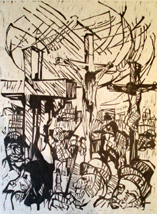 Boven een rij gehelmde en getulbande koppen steken de drie kruizen uit van Christus tussen beide moordenaars, het linker nog leeg (of het lichaam afgewend); op de achtergrond een rij vage gebouwen. De speer van de krijgsknecht wiens kop en hand midden op de voorgrond is te zien wijst naar Christus.