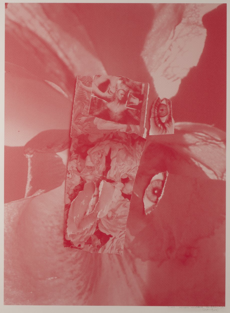 De Engelse voetballer Beckham, in een bekende reclamefoto afgebeeld als een moderne Christus, is opgenomen in een collage met andere voorstellingen van figuren. Rechts zijn onder elkaar twee grote open ogen afgebeeld. Zeefdruk in rode inkt.