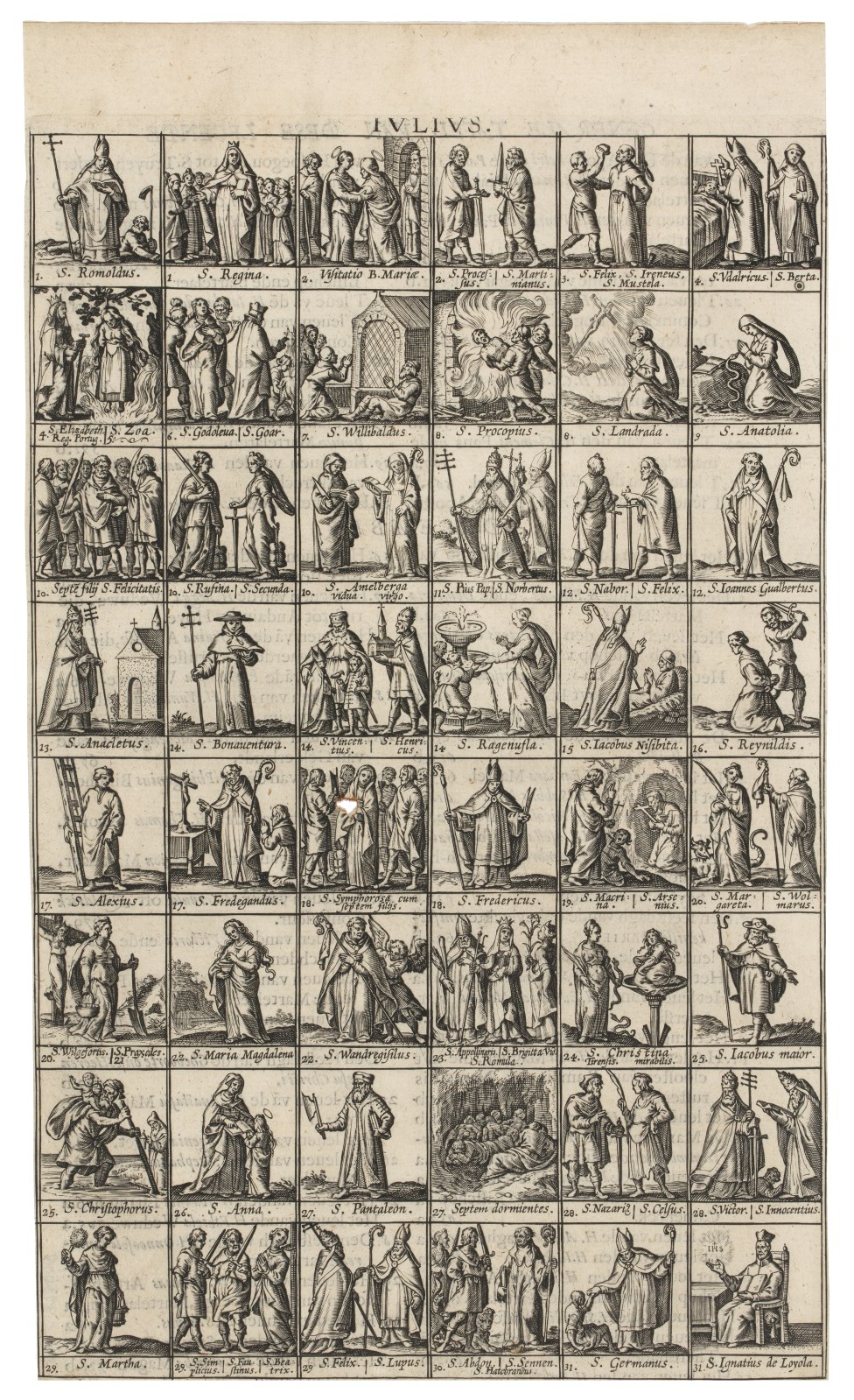 Pagina uit boek Generale legende der heylighen vergadert uut de H. Schrifture, Oude Vaders ende registers der H. Kercke.: Iulius, met heiligen van de maand juli