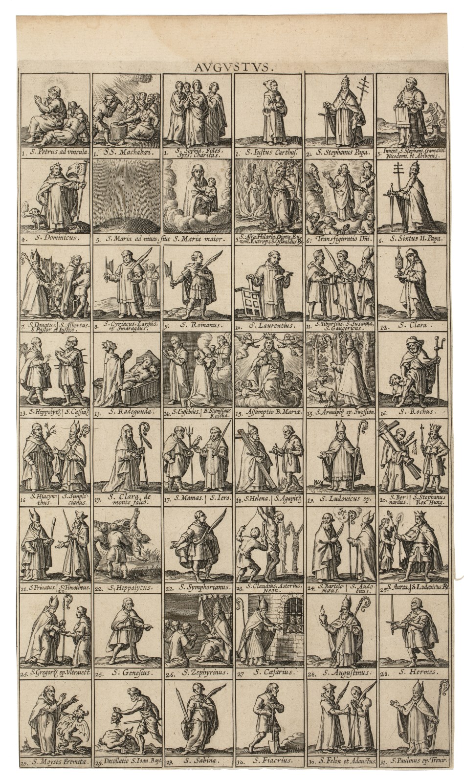 Pagina uit boek Generale legende der heylighen vergadert uut de H. Schrifture, Oude Vaders ende registers der H. Kercke.: Augustus, met heiligen van de maand augustus
