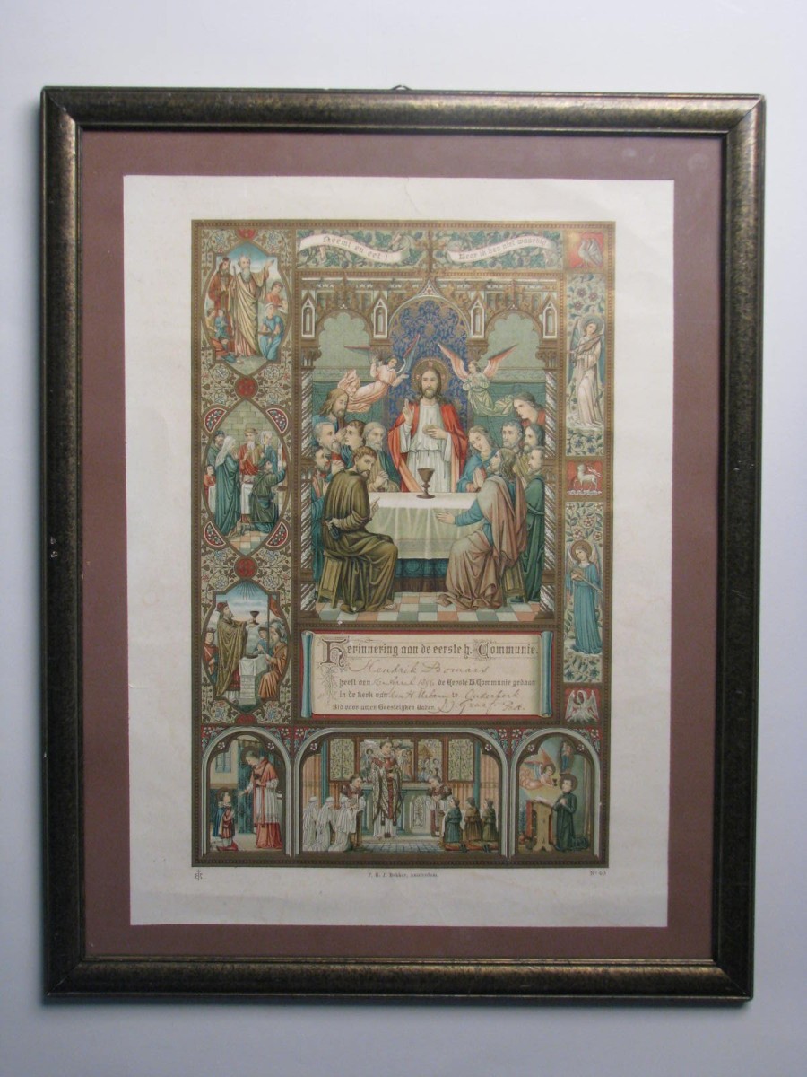 Communieprent ter herinnering aan de Eerste Heilige Communie van Hendrik Bomars met "Neem en eet!" en "Heer ik ben niet waardig." en als centrale voorstelling het Laatste Avondmaal. In de rand links en onder: de mannaregen, het joodse paasmaal, het offer van Abraham en Melchisedech, de H. Aloysius ontvangt de H. Communie, een priester deelt ...