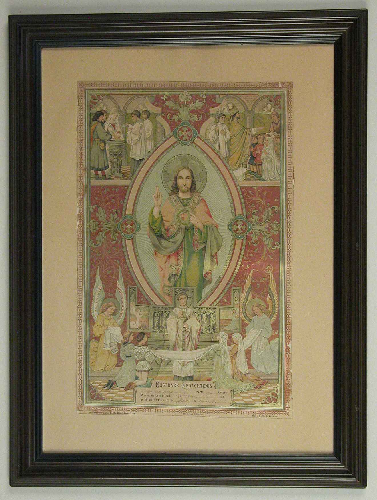 Communieprent met Christus wijzend op H. Hart omringd door de sacramenten van het doopsel, het vormsel en de eerste communie, met "... Jan van Ooyen ... 29sten april 1897 ... Nijmegen ..."