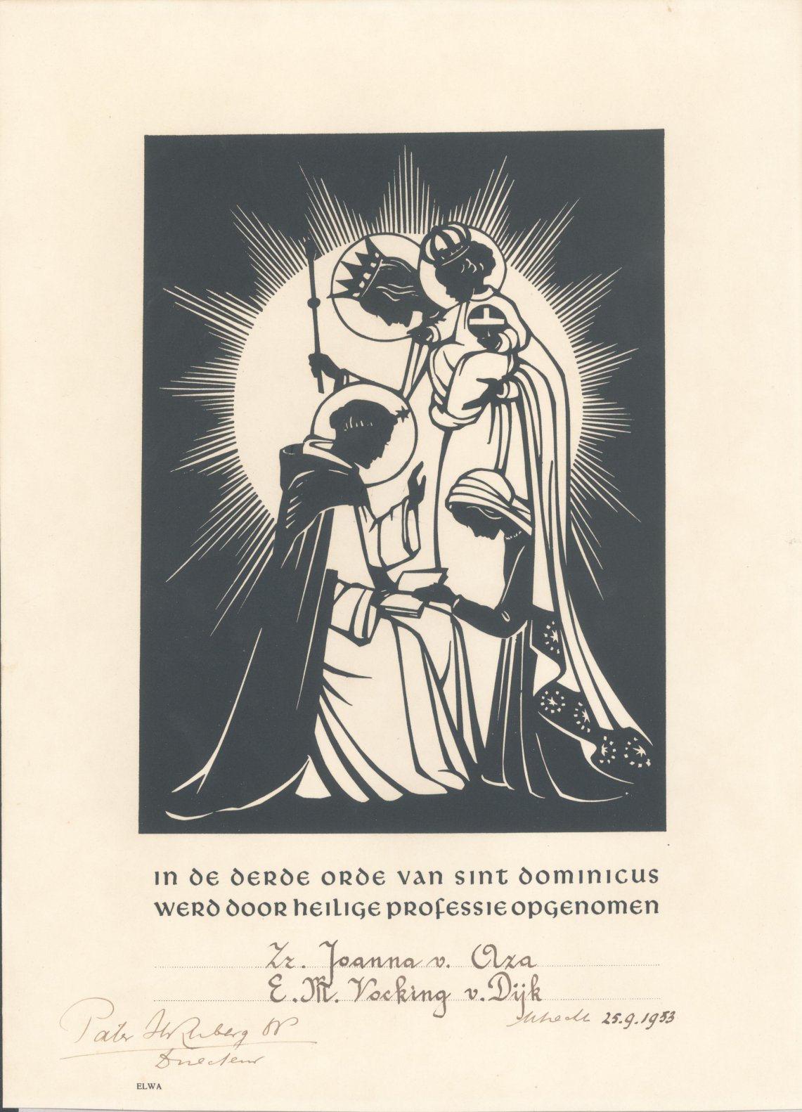 Lidmaatschapsprent, lid van de derde orde van Dominicus legt in de handen van Dominicus de gelofte af, onder toezicht van de Maagd Maria met Kind met "In de derde orde van sint Dominicus werd door de heilige professie opgenomen Zr. Joanna v. Aza, E.M. Vocking v. Dijk". Het document is ondertekend door pater H. Ruberg, ...