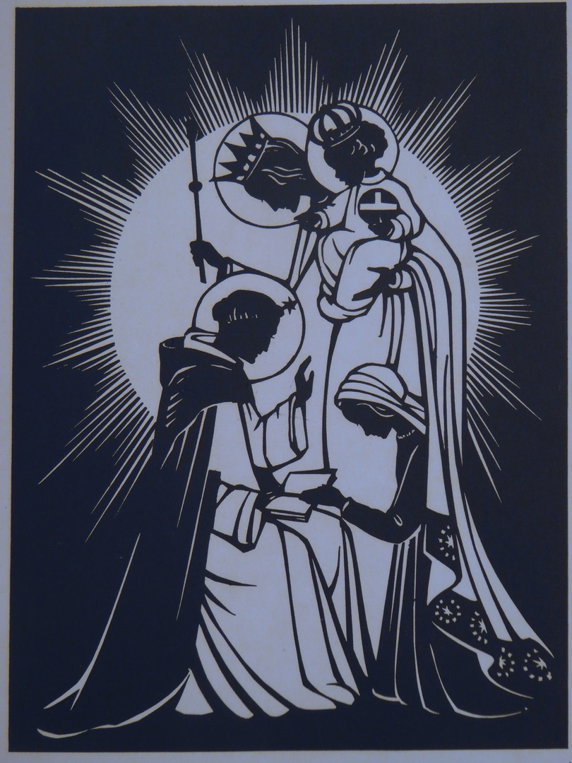 Lidmaatschapsprent, lid van de derde orde van Dominicus legt in de handen van Dominicus de gelofte af, onder toezicht van de Maagd Maria met Kind met "In de derde orde van sint Dominicus werd door de heilige professie opgenomen Zr. Joanna v. Aza, E.M. Vocking v. Dijk"