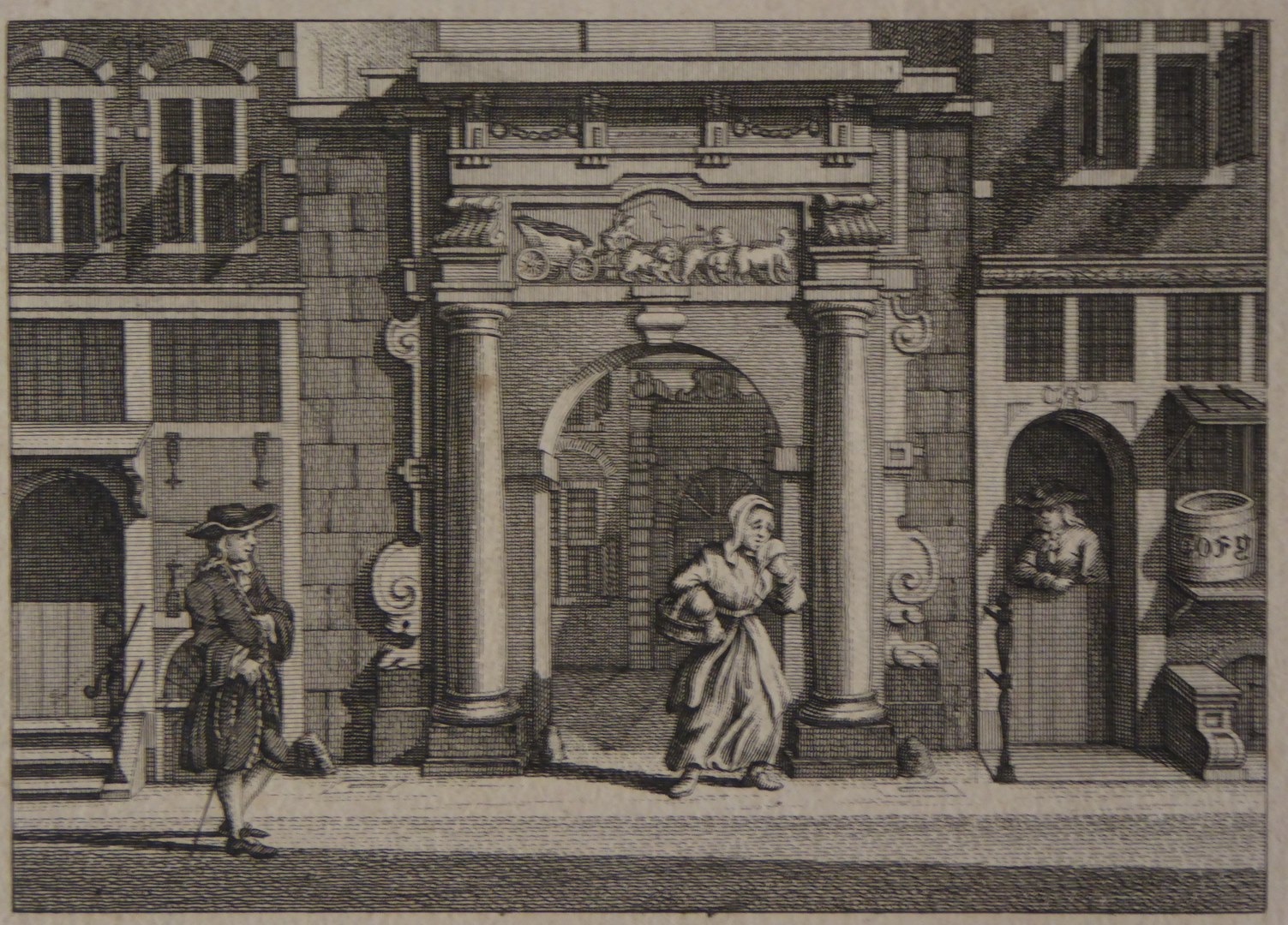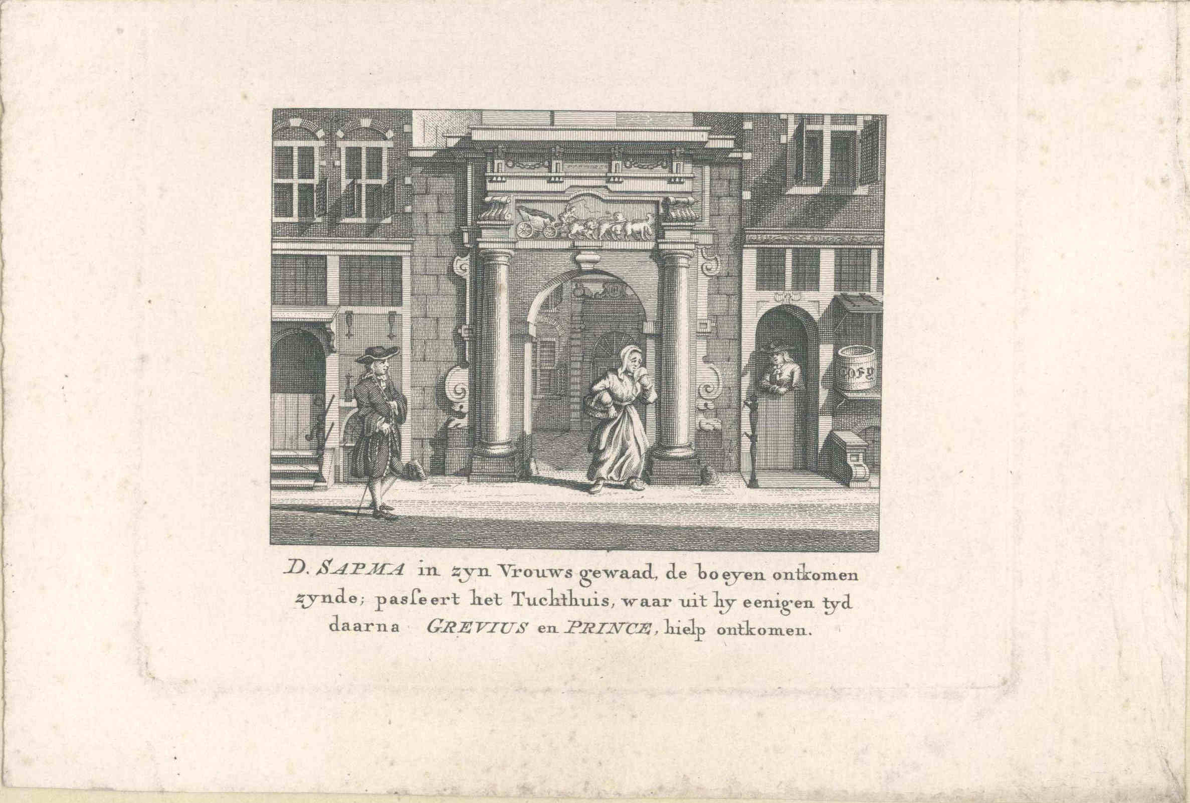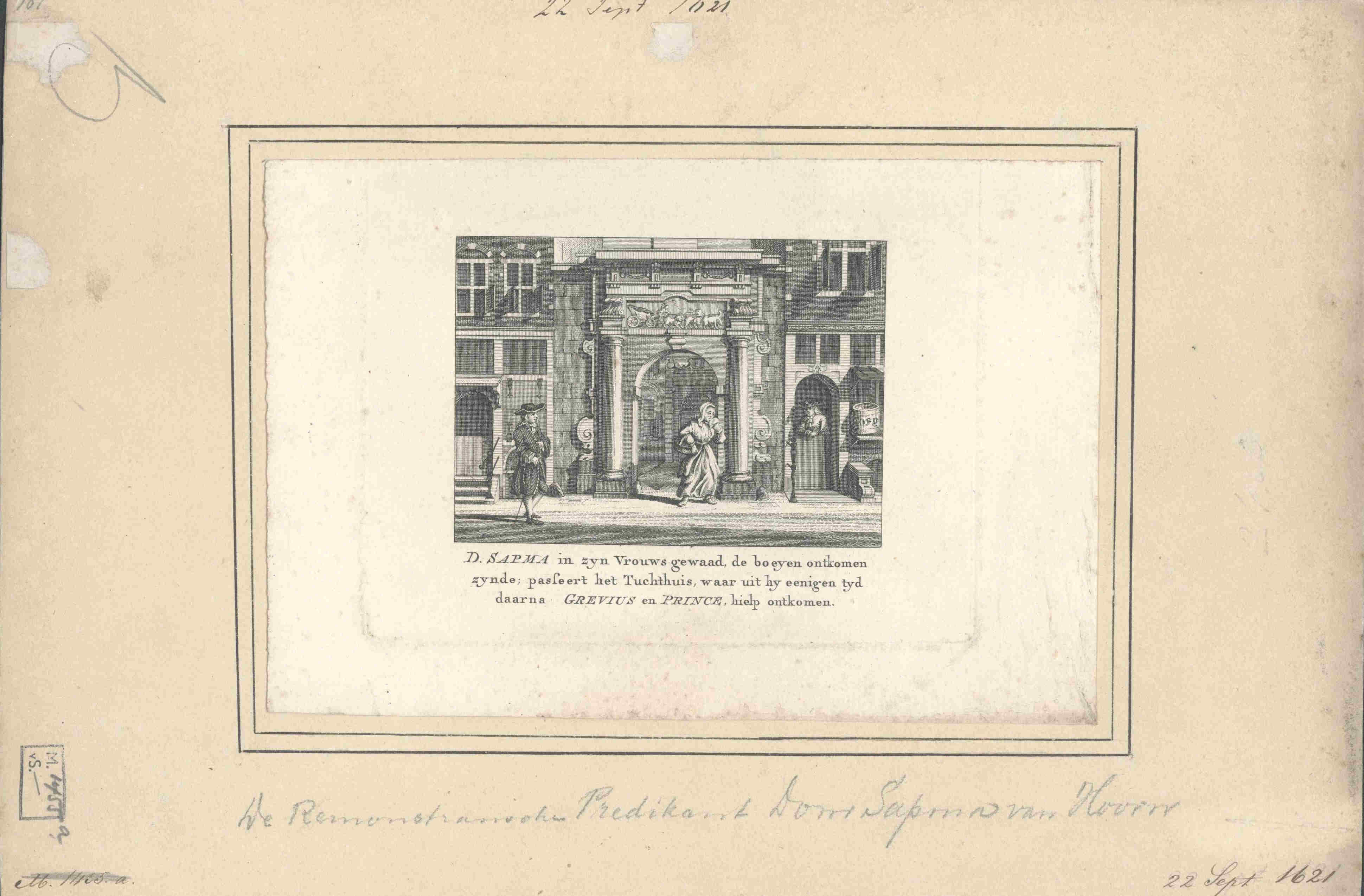 Prent op kartonnen vel bevestigd. Onderschrift op de prent: 'D. Sapma in zijn vrouws gewaad de boeyen ontkomen zynde, passeert het Tuchthuis, waar uit hij eenigen tijd daarna Grevius en Prince, hielp te ontkomen' Op het kartonnen opzetvel meerdere opmerkingen in potlood: '22 Sept. 1621', 'De remonstrantsche predikant Dom. Sapman van Hoorn', div. nummers. Op ...