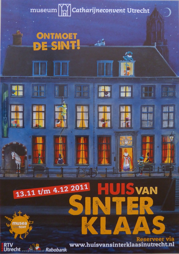 Affiche "Museum Catharijneconvent Utrecht, Ontmoet de Sint! 13.11 t/m 4.12 2011 Huis van Sinterklaas", met getekende gevel van Museum Catharijneconvent als huis van Sinterklaas