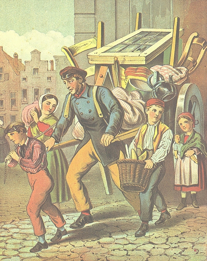 Ambachtsman Huibert met kar met huisraad en vier kinderen, behorend bij gedicht 'Sint Nikolaas (een sprookje)' van A.C.W. Staring, pagina uit boek