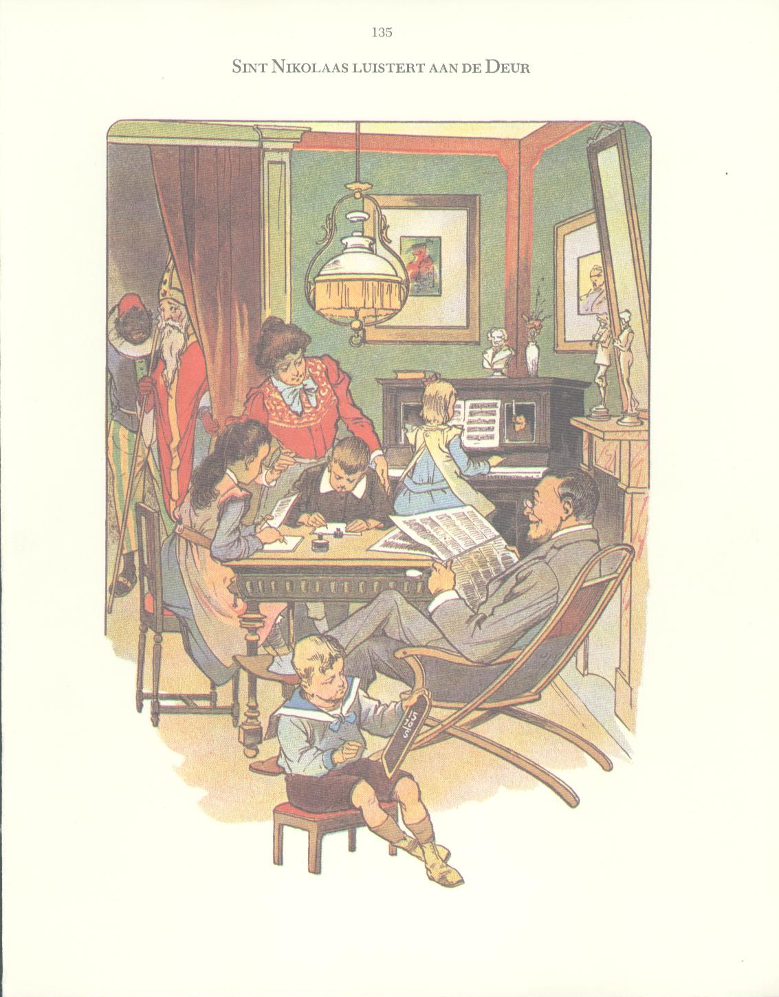 Sint Nikolaas luistert aan de deur, behorend bij 'St. Nikolaas en zijn knecht' van Jan Schenkman, p. 135, 136 uit boek