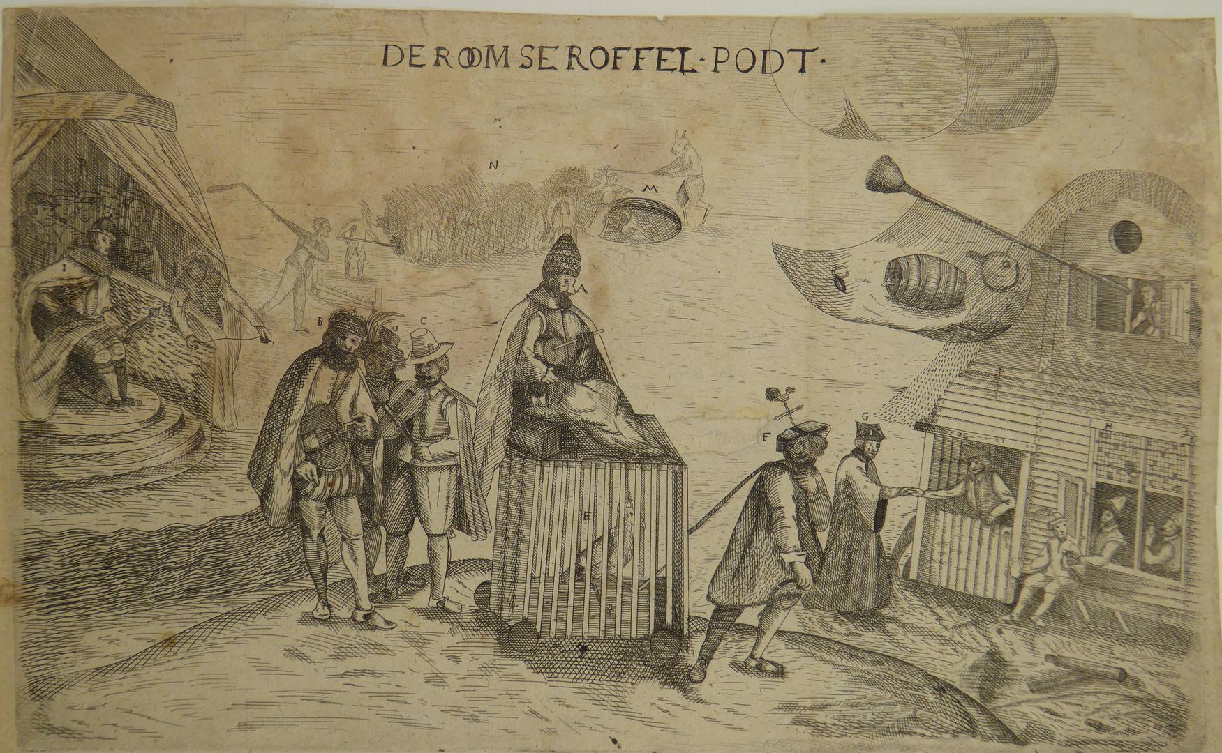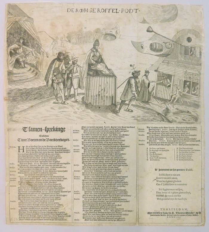De Roomse Roffel-Podt, met paus en koning van Spanje, eronder tekst "t'samen-sprekinge tusschen twee boeren en de boeckverkoper"